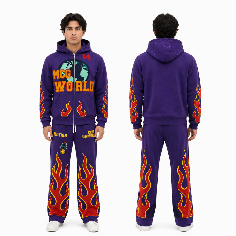 ชุดเซ็ตแทรคสูทลายเปลวไฟสีม่วงสำหรับผู้ชาย เสื้อฮู้ดดี้และกางเกงจ็อกเกอร์สไตล์สตรีทแวร์แบบกำหนดเอง ชุดกีฬาลายกราฟิกสองชิ้น ขายส่ง
