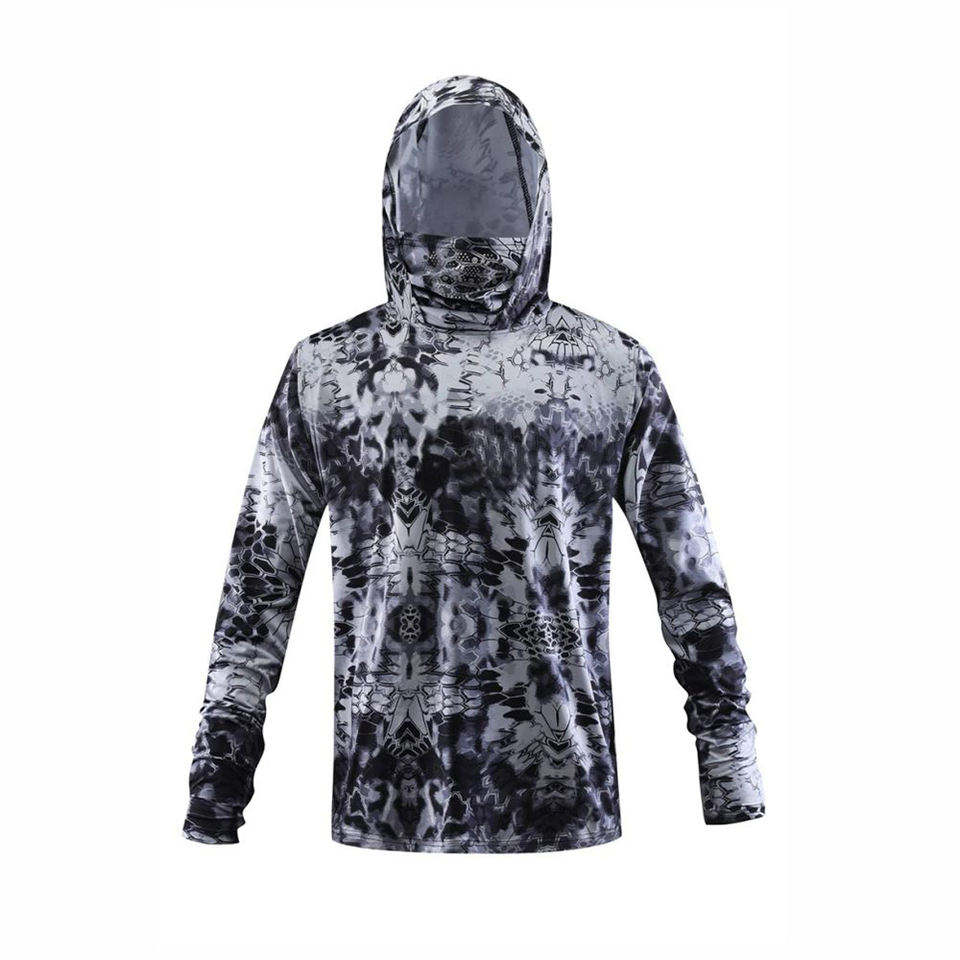 เสื้อตกปลาแขนยาวผู้ชายแบบแห้งเร็ว ระบายอากาศได้ดี ผลิตจากโพลีเอสเตอร์ พร้อมฮู้ด พิมพ์ลายแบบซับลิเมชั่น ป้องกันแสงแดด UPF 50 ไซส์ XL