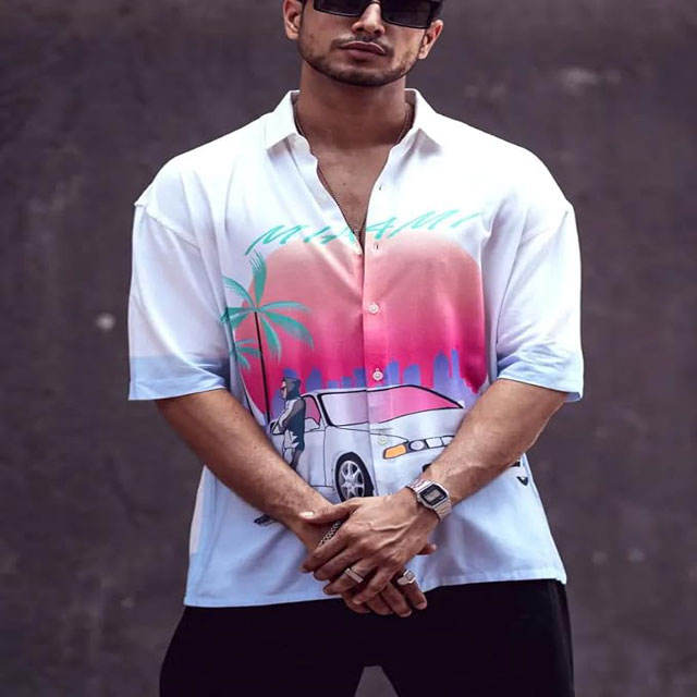 เสื้อกระดุมแขนสั้นของผู้ชายเสื้อยืดคอโปโลปกสีเหลืองพิมพ์ลาย