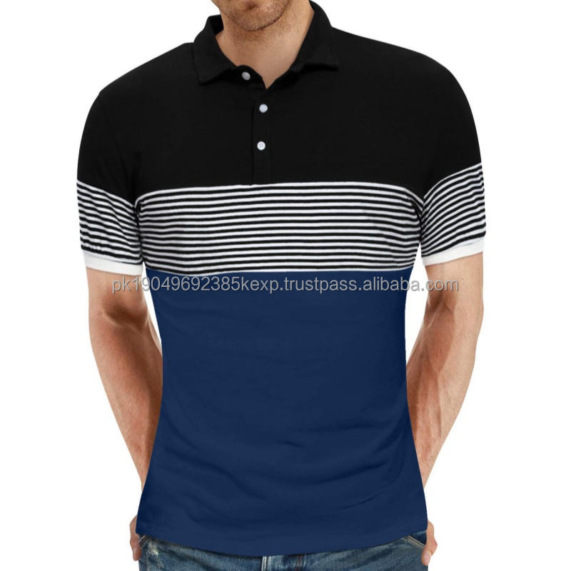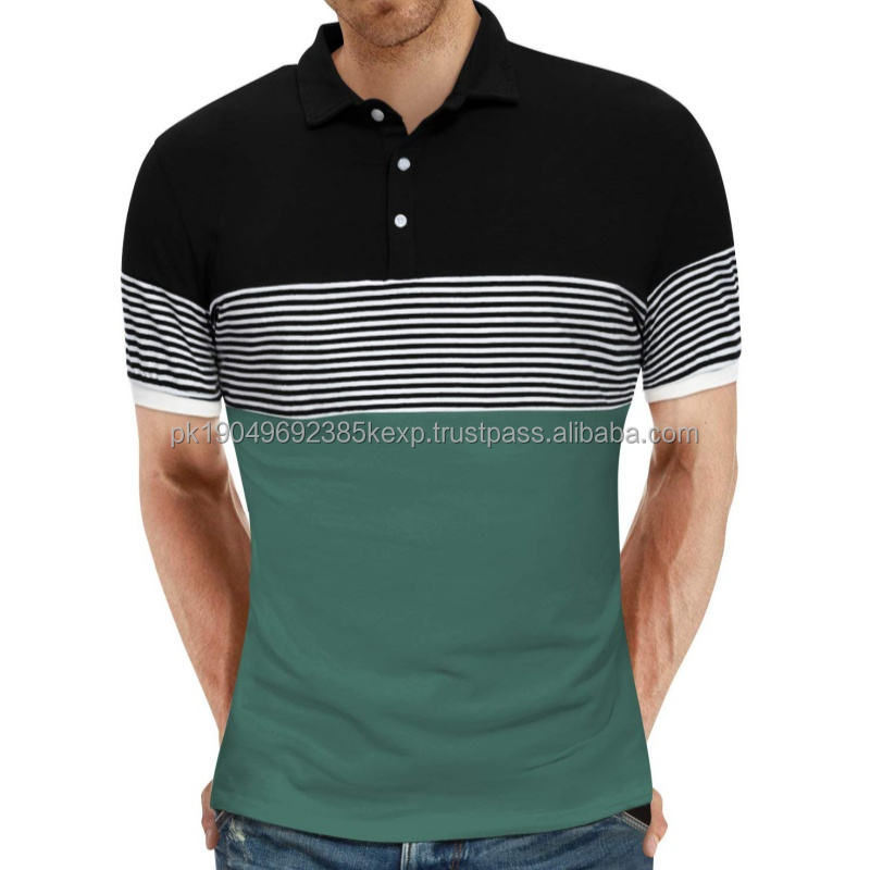 เสื้อโปโลแขนสั้นของผู้ชายเสื้อคอตตอนลายทางปะสีตัดกันแนวสปอร์ตลำลอง