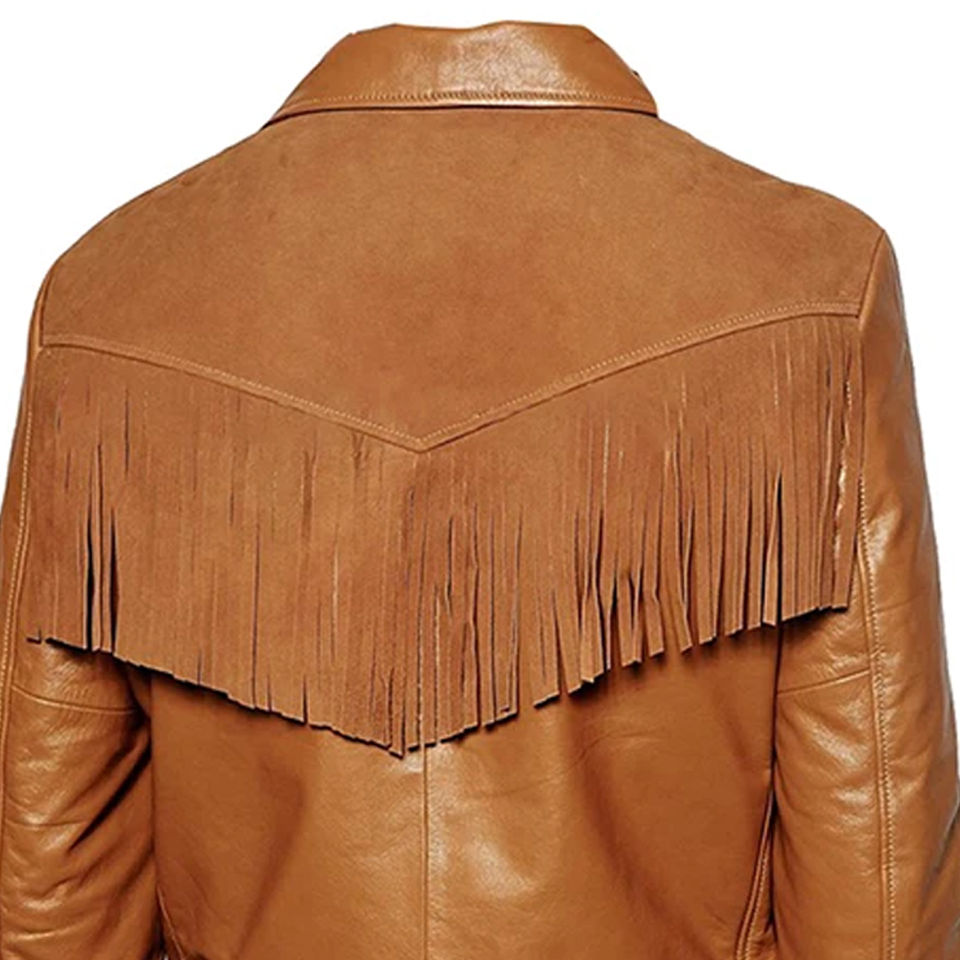 แจ็คเก็ตหนังกลับทรงคาวบอยผู้ชายแบบสลิมฟิต ปกคอพับ แต่งชายครุย รับผลิตแบบ OEM/ODM ปักโลโก้ด้านหน้า กันน้ำ เป็นมิตรต่อสิ่งแวดล้อม