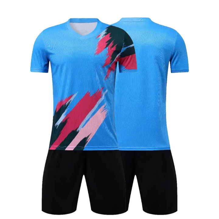 ชุดฟุตบอลชายแบบสั่งทำพิเศษ | ชุดฟุตบอลสีน้ำเงินและชมพูแบบซับลิเมชั่น | ชุดฝึกอบรมทีม OEM | บริการพิมพ์เสื้อผ้ากีฬาแบบจำนวนมาก