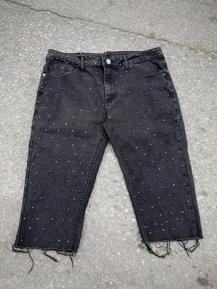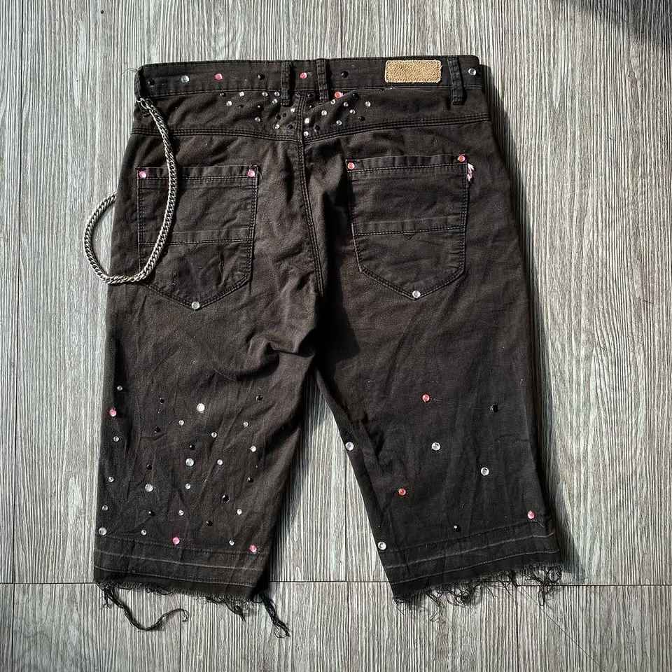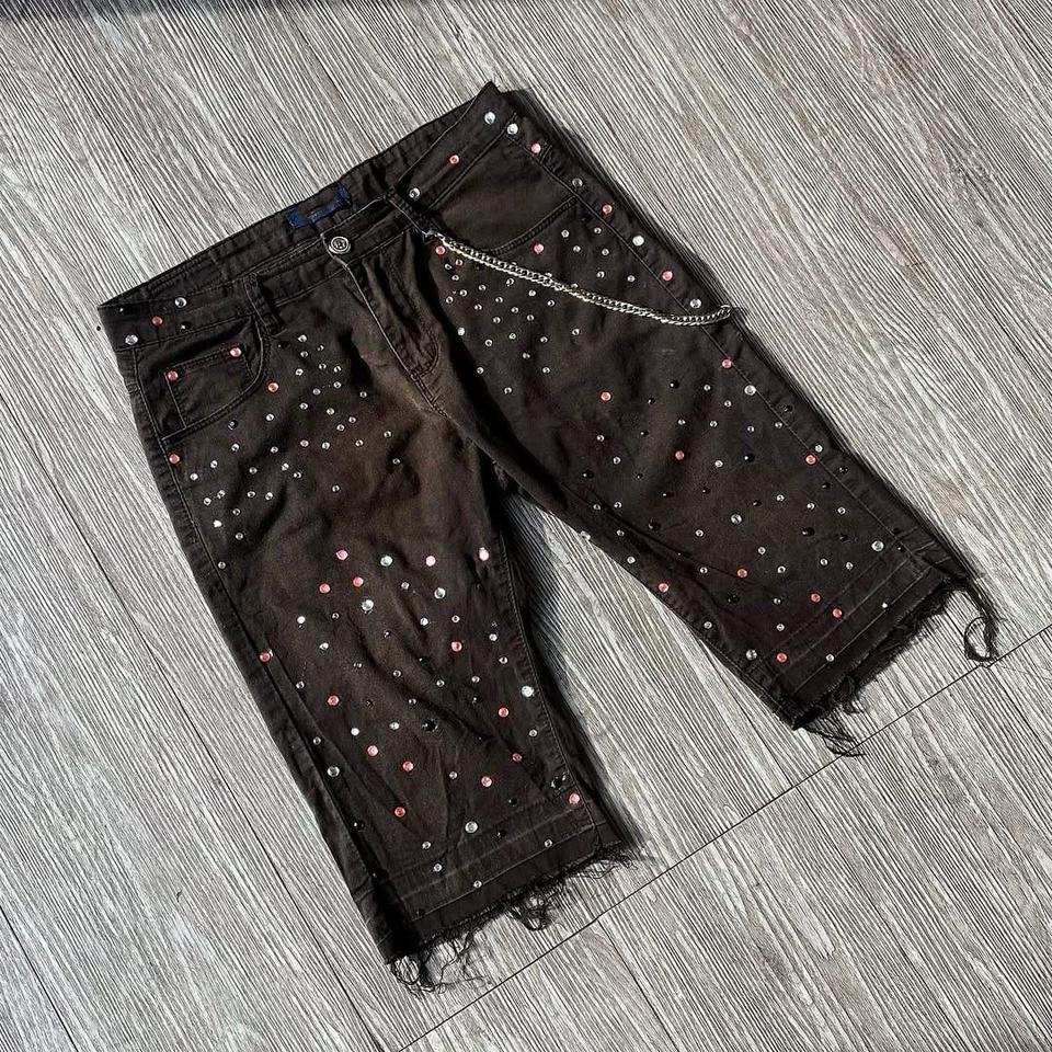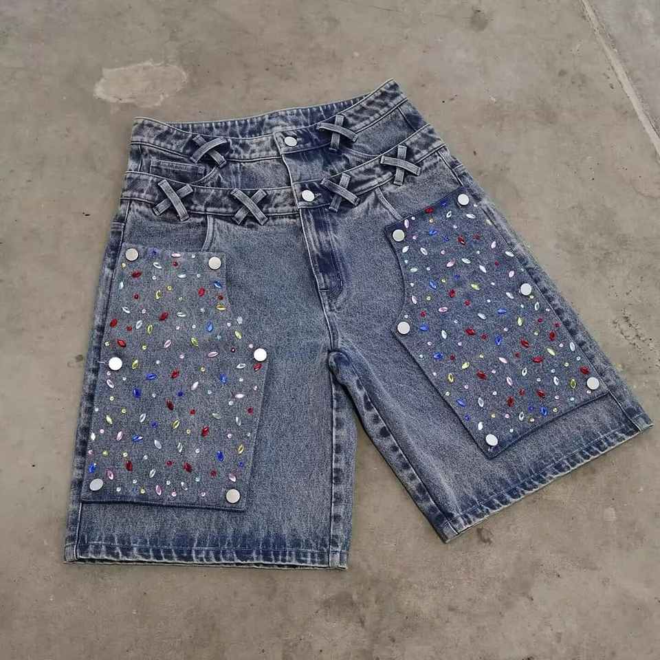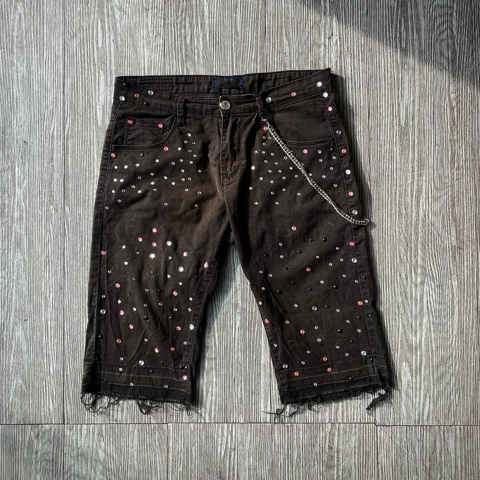 กางเกงยีนส์ขาสั้นผู้ชายสไตล์สตรีทแวร์ ผ้าเดนิมหนา ตกแต่งด้วยคริสตัล ซิปวินเทจ ผ้าฝ้าย 100%