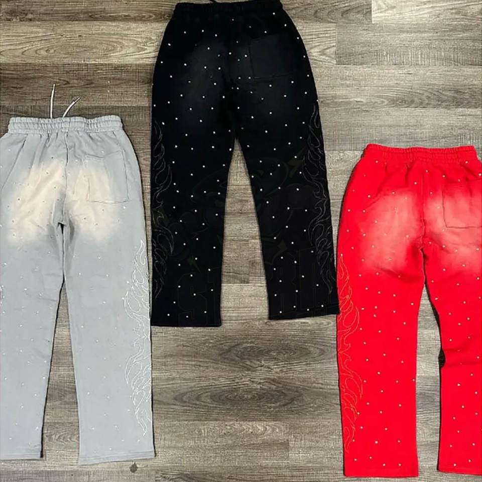 กางเกงวอร์มแนวสตรีทของผู้ชายกางเกงผู้ชายกางเกงขาบานซีดซีดซีดซีดซีดฝนกรดทรงหลวมกับเอวพลอยเทียมและจีบ