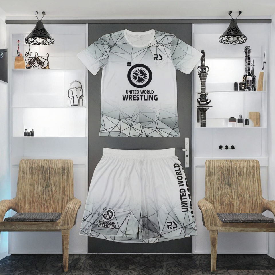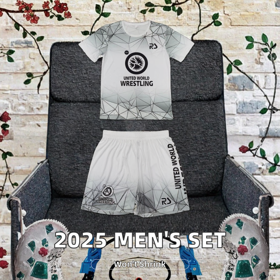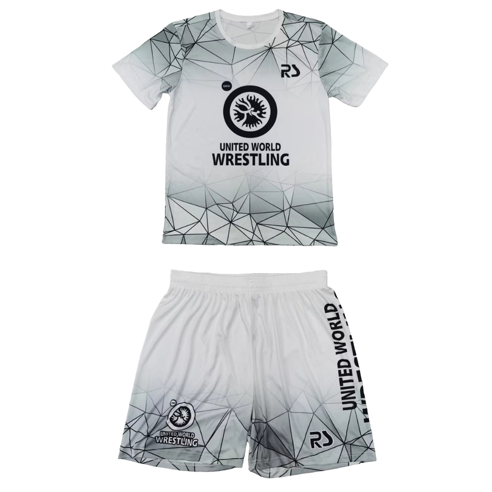 ชุดนักมวยปล้ำผู้ชายแบบยืดได้ 2 ชิ้น เสื้อยืดและกางเกงขาสั้นพิมพ์ลายโลโก้ด้านหน้า แบบซับลิเมชั่นเต็มตัว ไซส์สากล