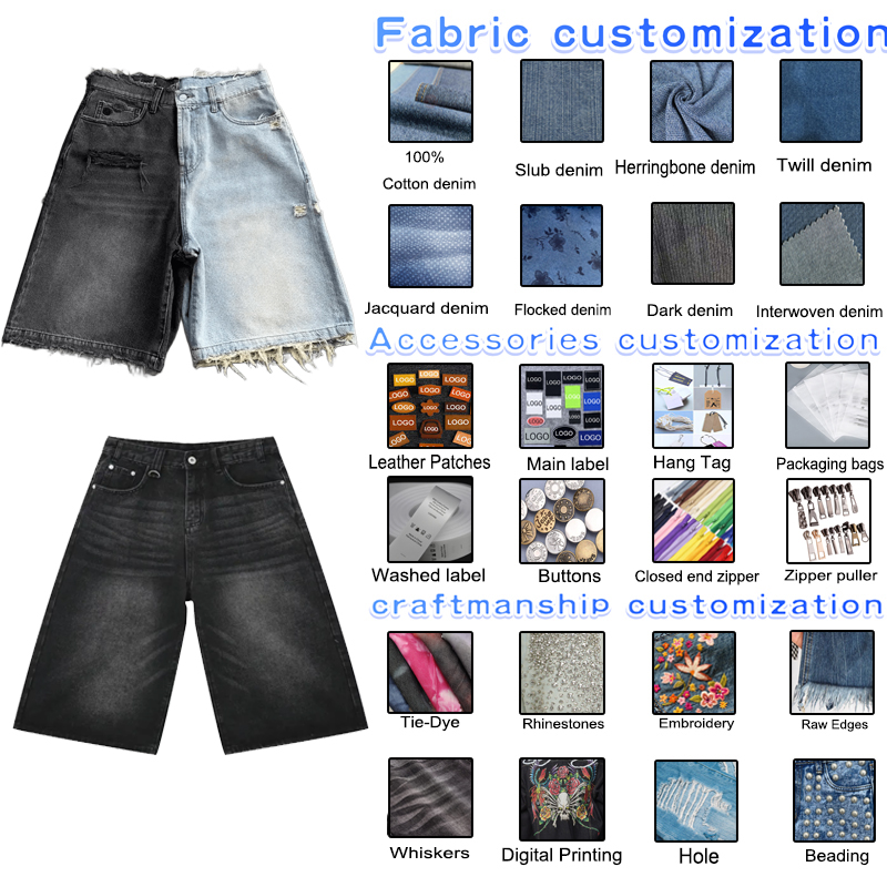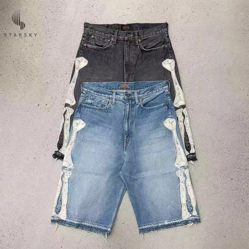 กางเกงขาสั้นผ้ายีนส์ฟอกกรดของผู้ชายกางเกงขาสั้นผ้าทอสไตล์วินเทจแนวสตรีทฮิปฮอปตรงผ้าทอเป็นมิตรต่อสิ่งแวดล้อมสำหรับฤดูร้อน