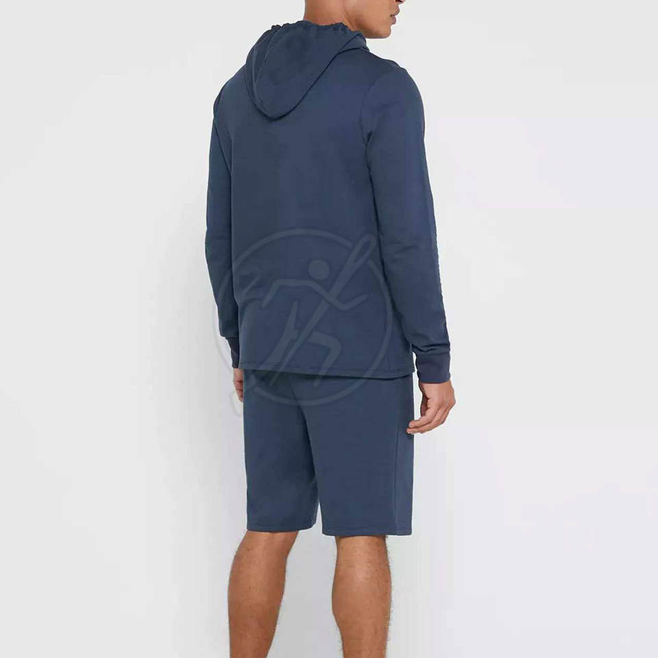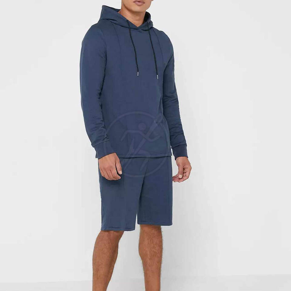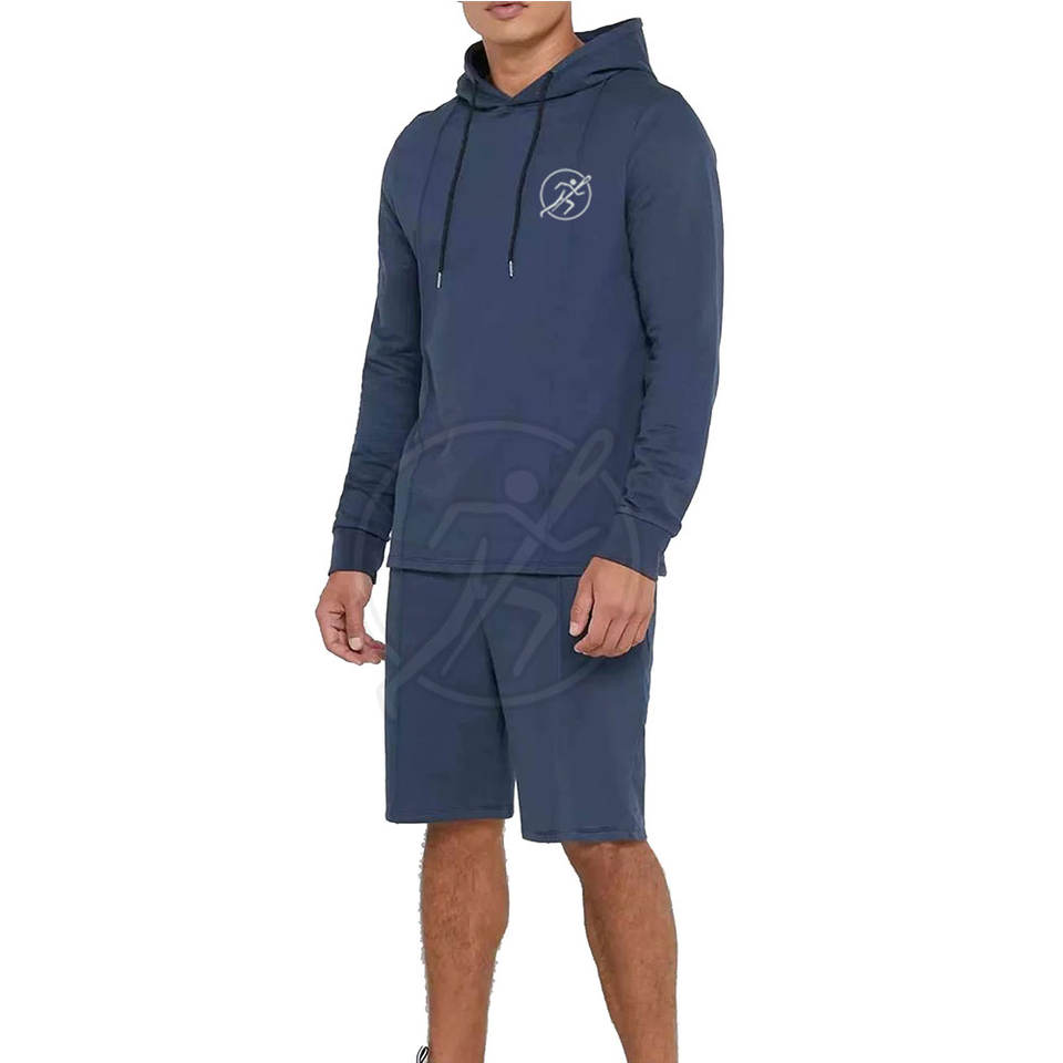 ชุดสั้นสำหรับผู้ชายเสื้อมีฮู้ดสไตล์สตรีทและกางเกงขาสั้นยาวถึงเข่าแบบกำหนดเองชุดฤดูร้อน