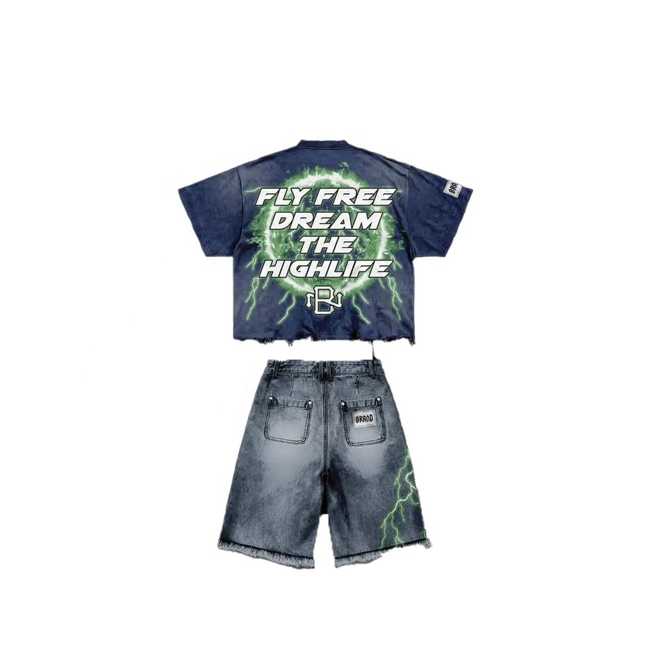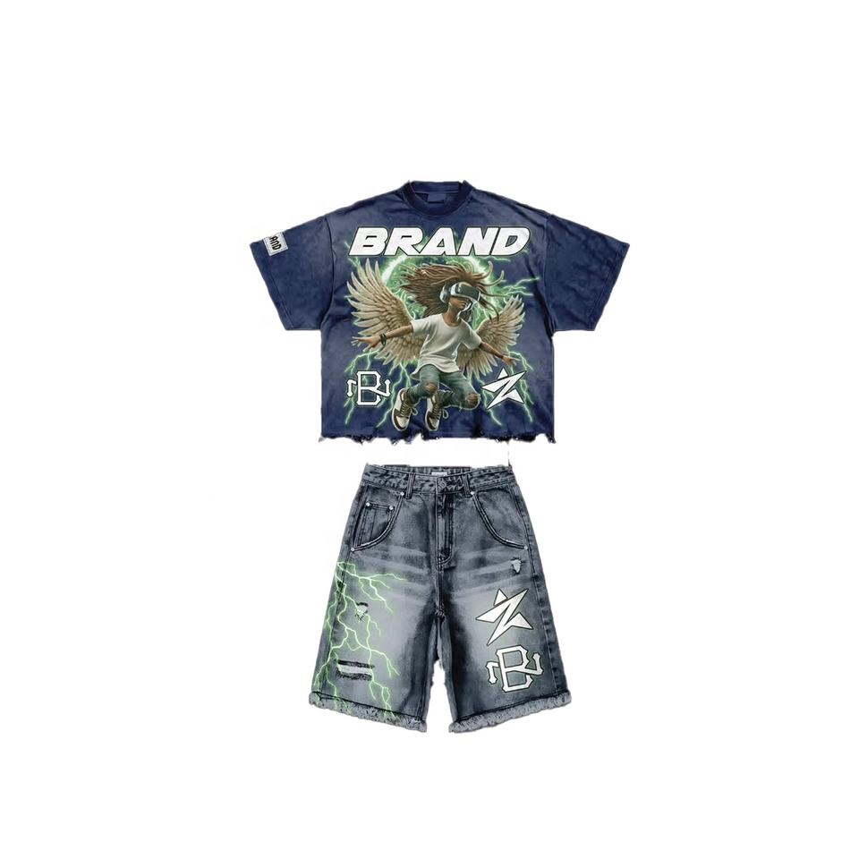 ชุดเสื้อยืดผู้ชายแบบสั่งทำชุดยางยืดรัดเอวปกเสื้อลายหินมีระบายระบายขนาดพิเศษกางเกงขาสั้นสำหรับฤดูร้อน