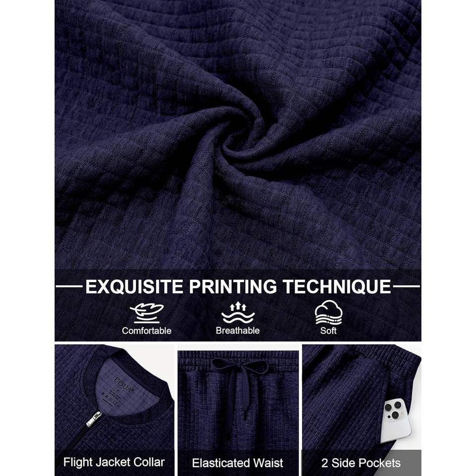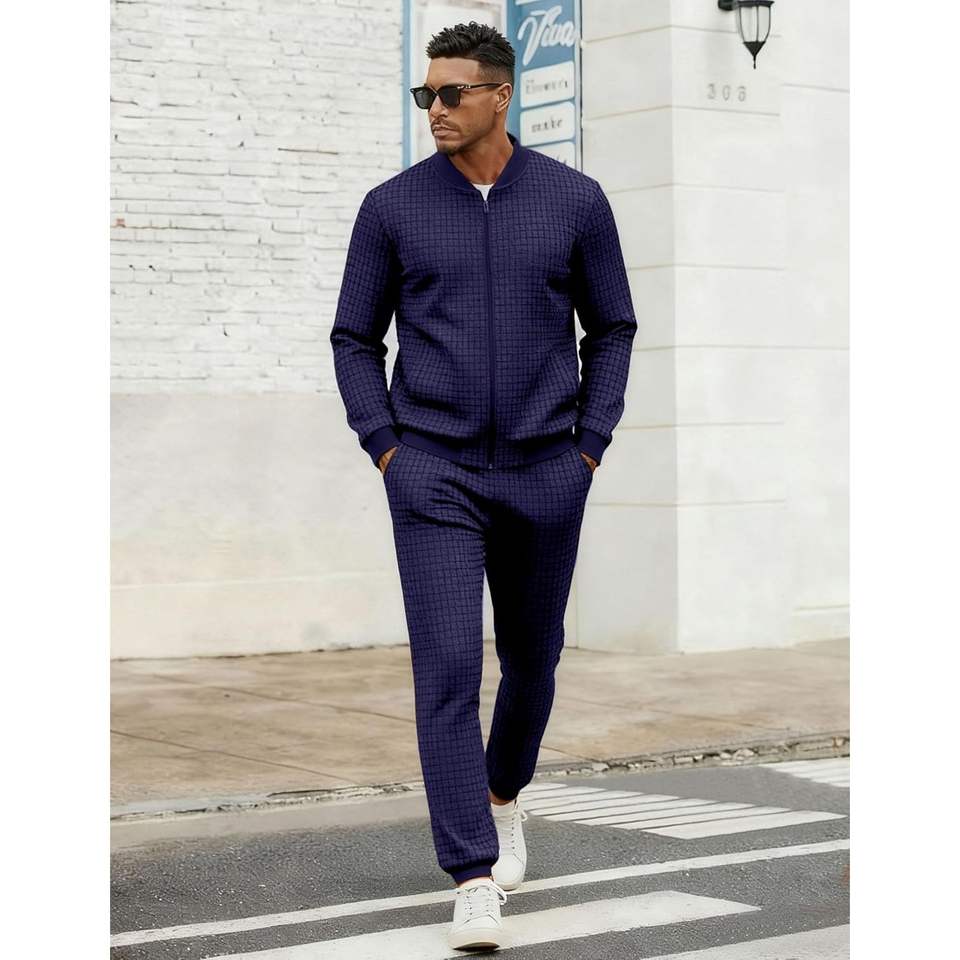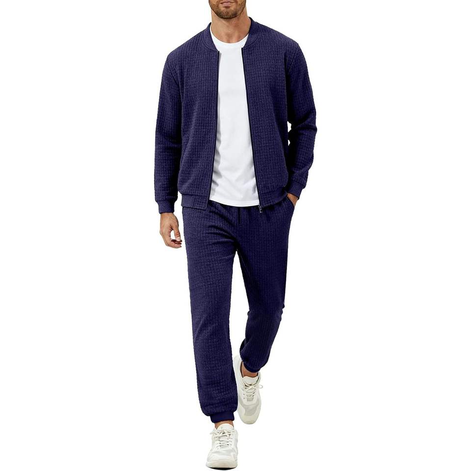 ชุดวอร์มผู้ชายแบบกำหนดเอง 2 ชิ้น ชุดเซ็ตซิปเต็มตัว ลายวาฟเฟิล ผ้าแจ็คการ์ด ชุดลำลองสำหรับออกกำลังกาย ชุดวิ่งจ๊อกกิ้ง น้ำหนักปานกลาง ระบายอากาศได้ดี