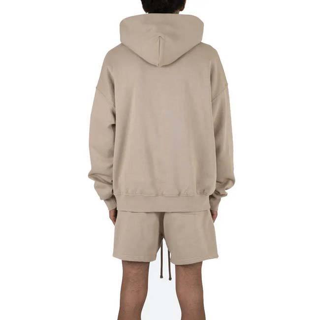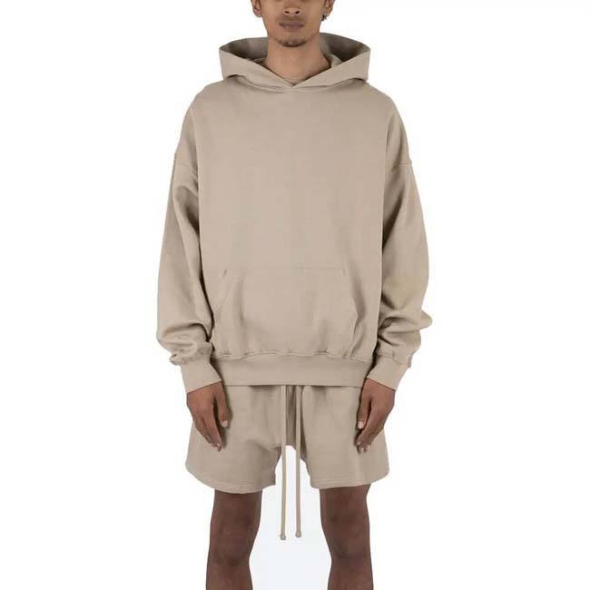 ชุดกีฬาสองชิ้นของผู้ชายชุดกางเกงขาสั้นมีฮู้ดสำหรับฤดูหนาวผ้าฝ้าย100% ระบายอากาศได้ดีสีทึบสไตล์สตรีทยิมตามสั่ง