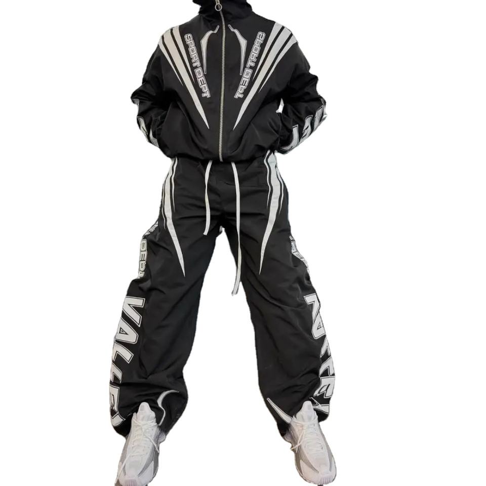 เสื้อกันลมและกางเกงของผู้ชายกำหนดได้เองชุดวอร์มผ้าไนลอนมีซิปผ้าโพลีเอสเตอร์สีทึบ