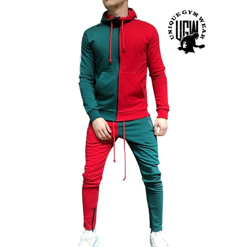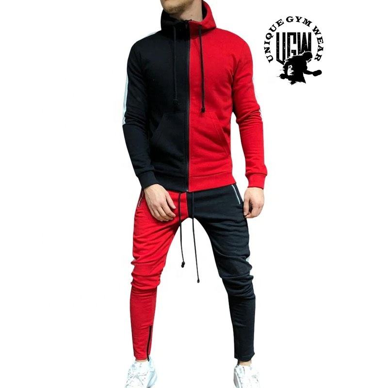 ชุดวอร์มแฟชั่นผู้ชายแบบสองสี ทรงปกติ เสื้อฮู้ดแบบสวมหัว กางเกงจ็อกเกอร์ ชุดออกกำลังกายฤดูหนาว