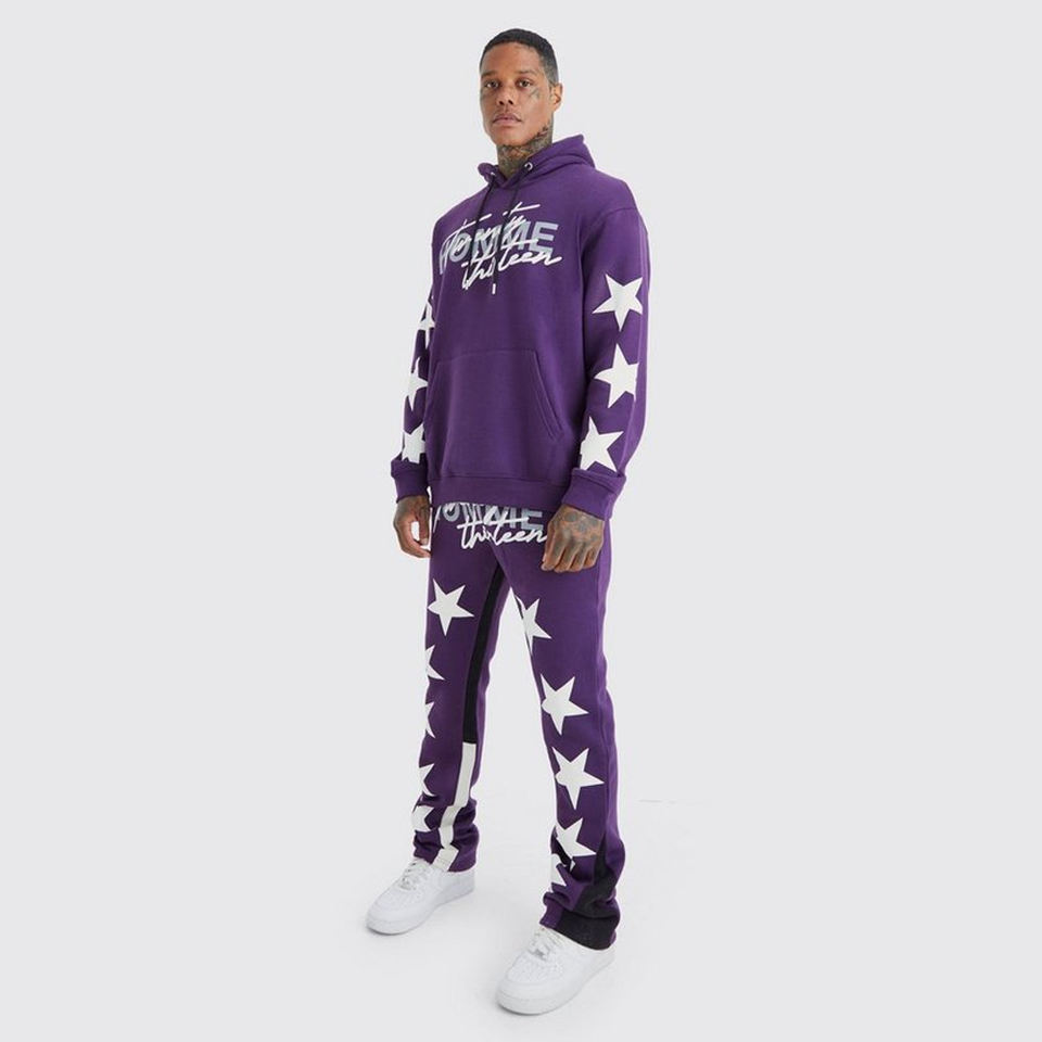 ชุดเซ็ตสเวตสูทผู้ชายสไตล์วินเทจ ล้างสีแบบแอซิดวอช ทรงขาบาน ระบายอากาศได้ดี แห้งเร็ว ผ้าฟลีซ 100% คอตตอน ไซส์พลัส สำหรับฤดูหนาว ลายพิมพ์ปัก
