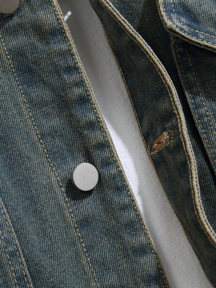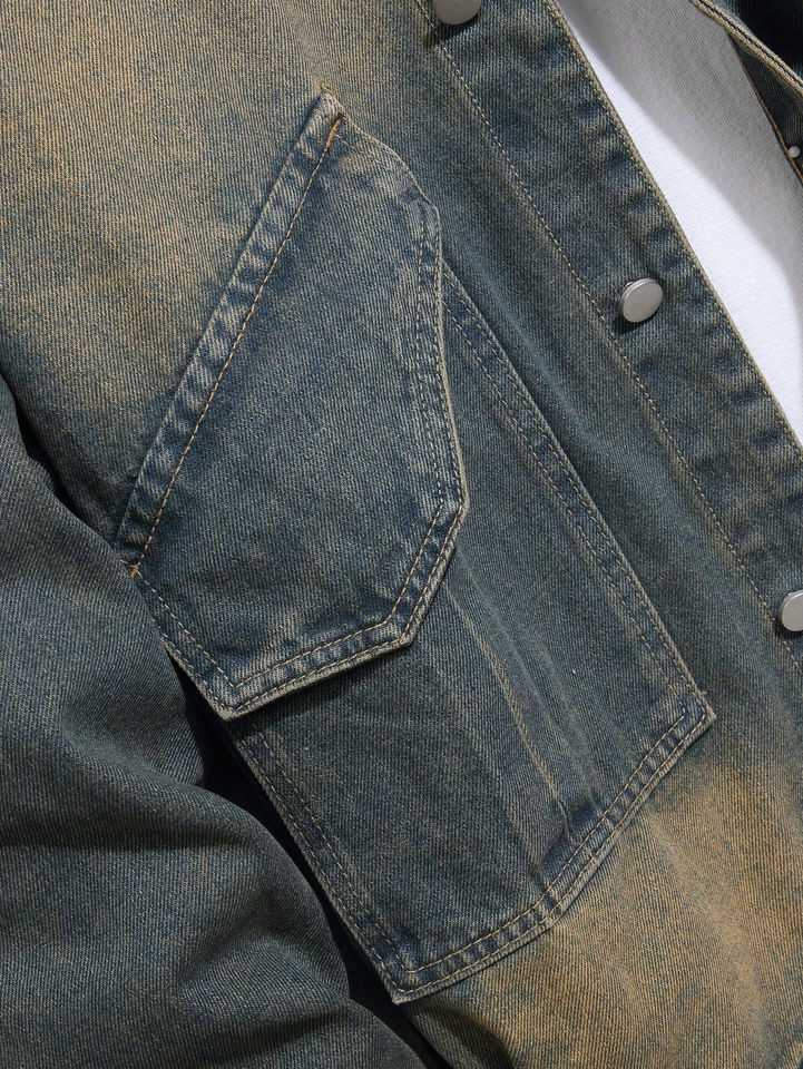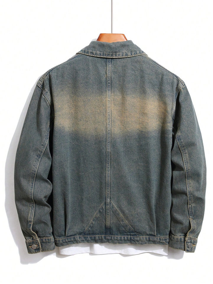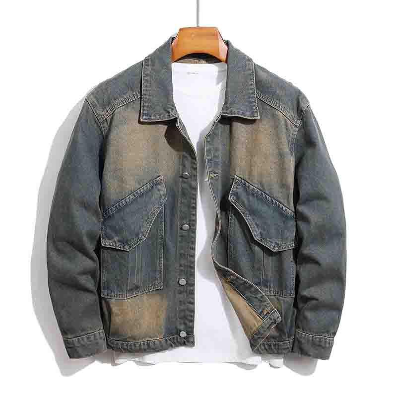 แจ็กเก็ตยีนส์แบบย้อนยุคของผู้ชายผ้าคอตตอน100% โอเวอร์ไซส์มีกระเป๋าซักลายจุดสำหรับฤดูใบไม้ผลิผลิตตามสั่ง