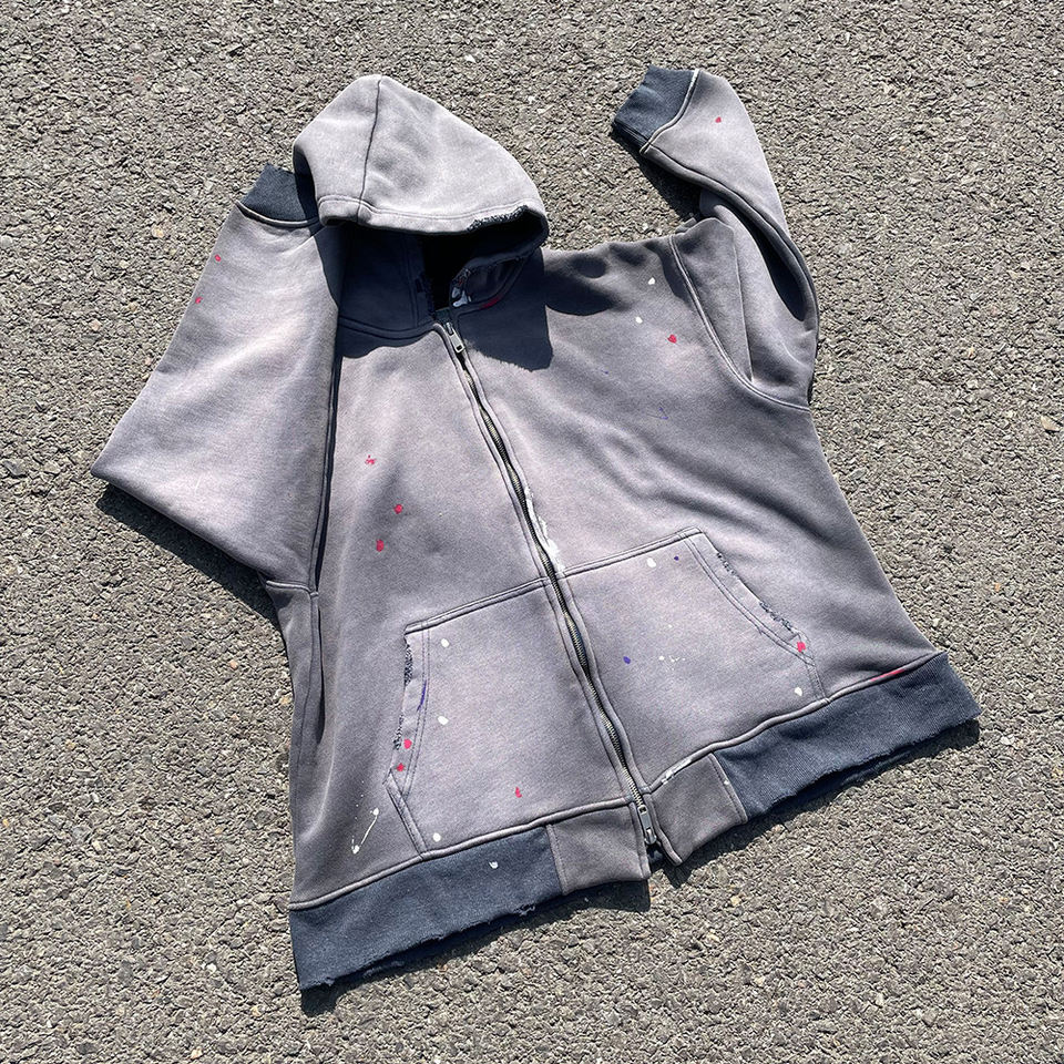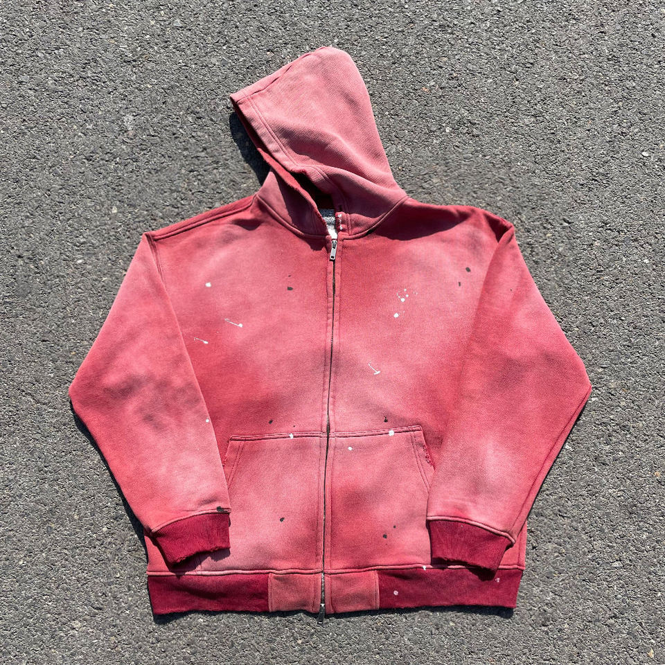 ผู้ผลิตเสื้อฮู้ดดี้วินเทจผู้ชายแบบกำหนดเอง คุณภาพสูง ผ้าฝ้าย 100% สไตล์ลำลอง ลุคซักฟอก ลายพิมพ์สาดสี ซีดจาง แบบมีซิป