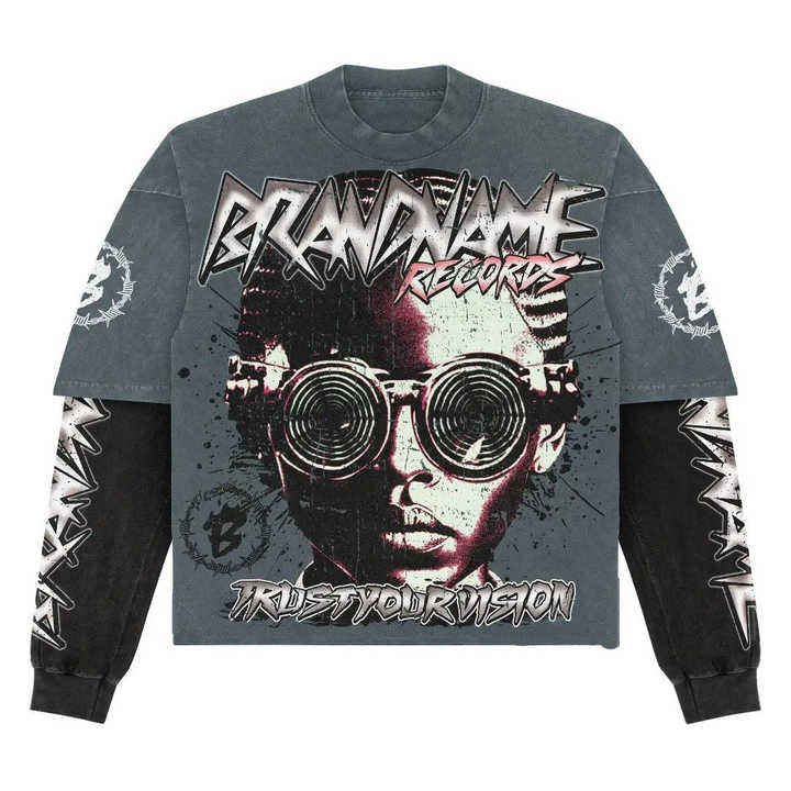 เสื้อยืดแขนยาวผู้ชายสไตล์วินเทจผ้าเจอร์ซีย์คอตตอน 100% สองชั้น คุณภาพสูง พิมพ์ลายดิจิตอล ไซส์ใหญ่ สีพื้น