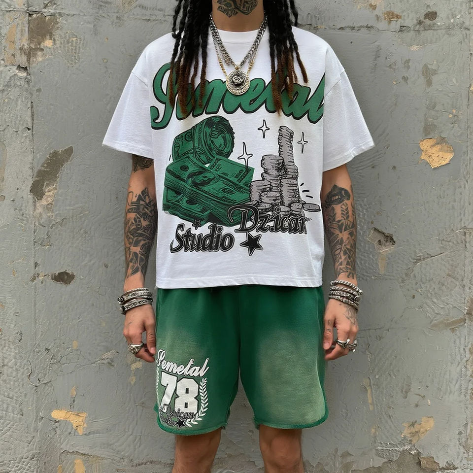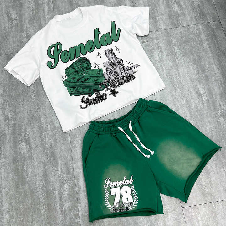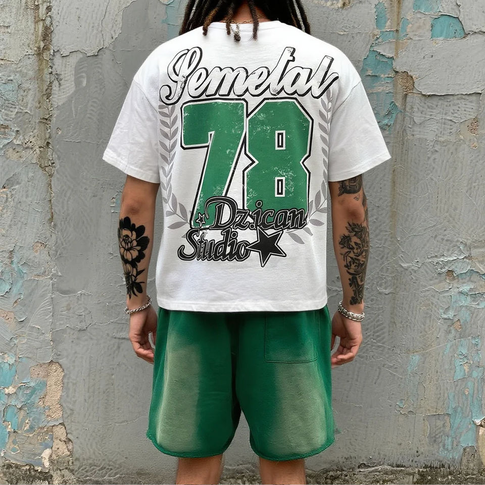 ชุดเสื้อยืดและกางเกงขาสั้นผู้ชายสไตล์วินเทจ ล้างสีแบบแอซิดวอช ผ้าฝ้าย 100% คอโอ ทรงโอเวอร์ไซส์