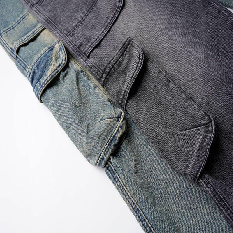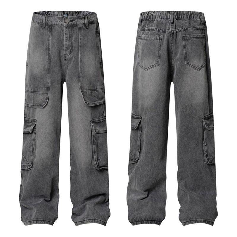 Custom Tactical Vintage Washed Cargo Premium Quality Denim Jeans Wide Leg Loose Fit Multi Pocket Streetwear Wholesale