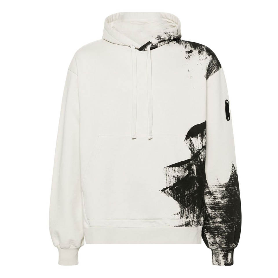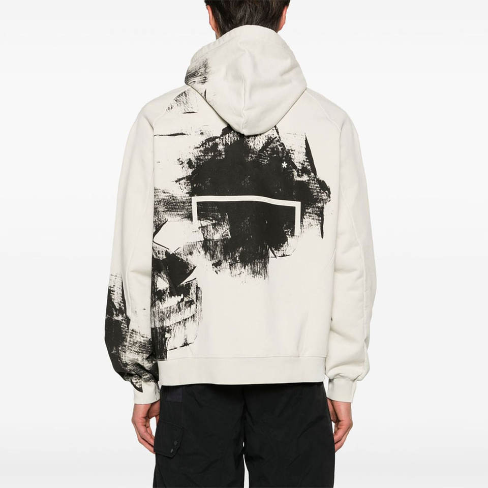 เสื้อฮู้ดดี้ผู้ชายสีขาวทรงโอเวอร์ไซส์ สไตล์สตรีทแวร์ ลายกราฟิกสีดำ ผ้าฟลีซหนานุ่ม ทรงหลวมไหล่ตก