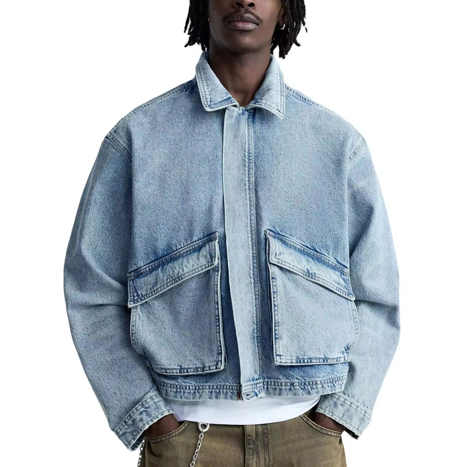 แจ็กเก็ตยีนส์สำหรับผู้ชายแบบปรับแต่งได้กระเป๋าทรงหลวมไม่มีปกย้อมสีเรียบสำหรับฤดูหนาวเป็นมิตรกับสิ่งแวดล้อม