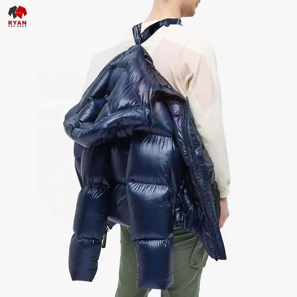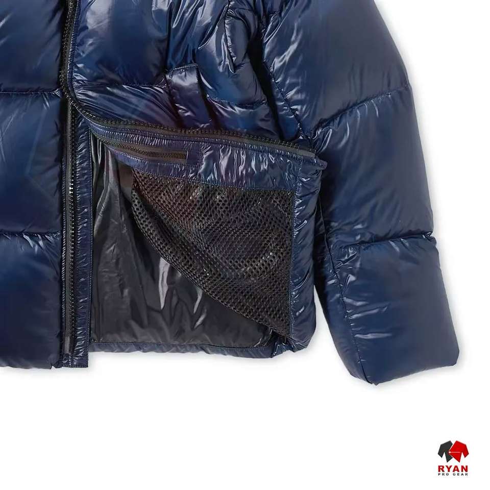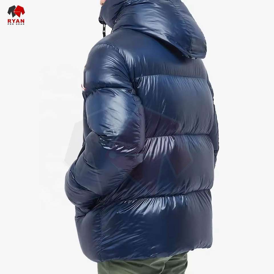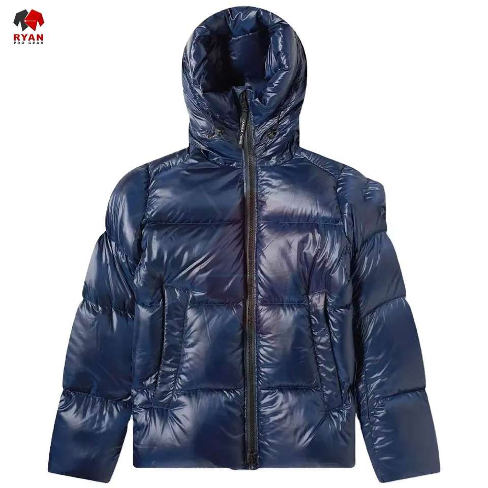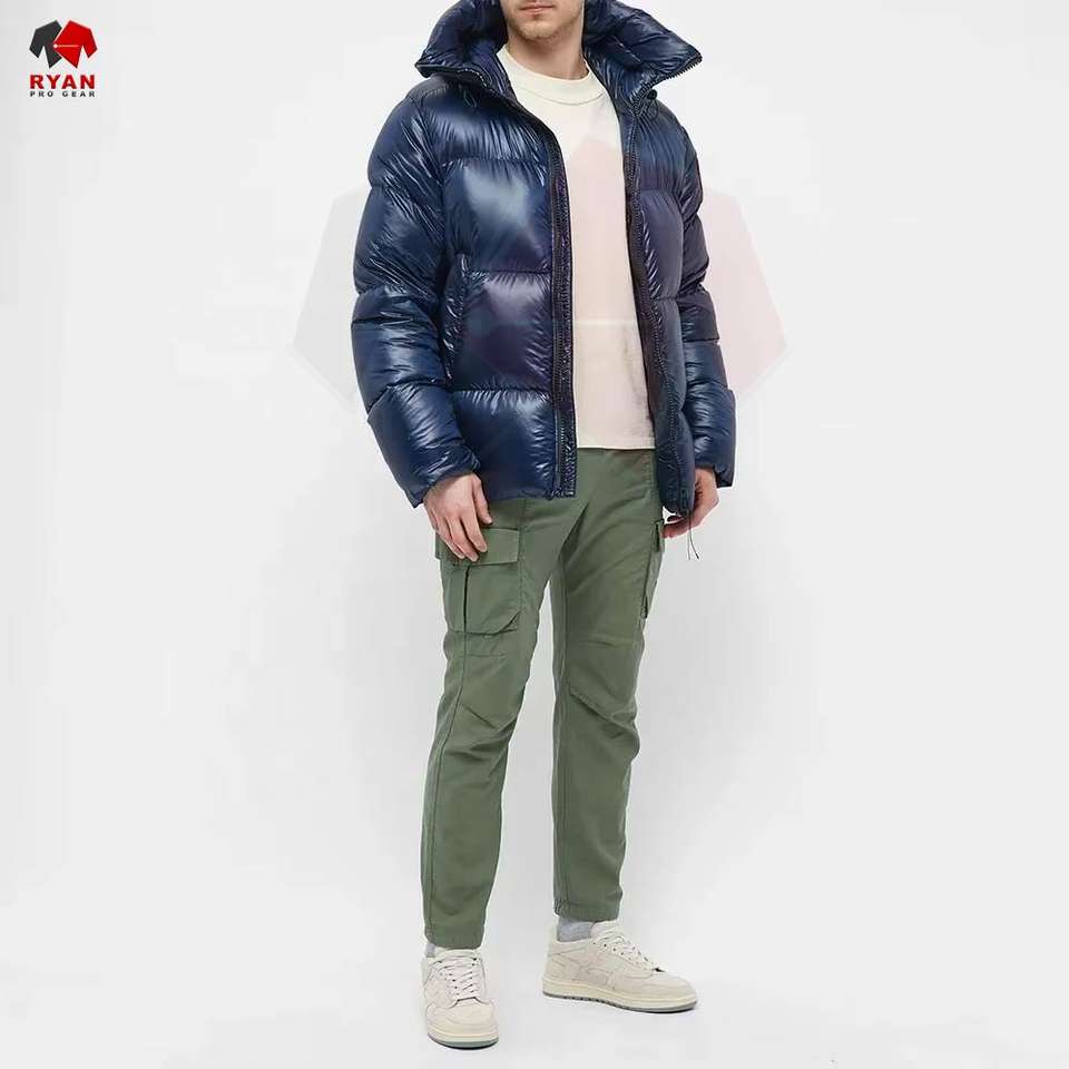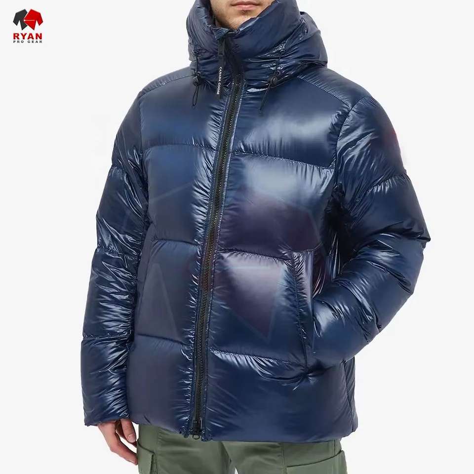 เสื้อแจ็คเก็ตพัฟเฟอร์ผู้ชายแบบกำหนดเองสำหรับฤดูหนาว มีฮู้ด คอตั้ง สไตล์ลำลอง ผ้าทอ ย้อมสีพื้น ออกแบบโลโก้ด้านหน้าได้ตามต้องการ