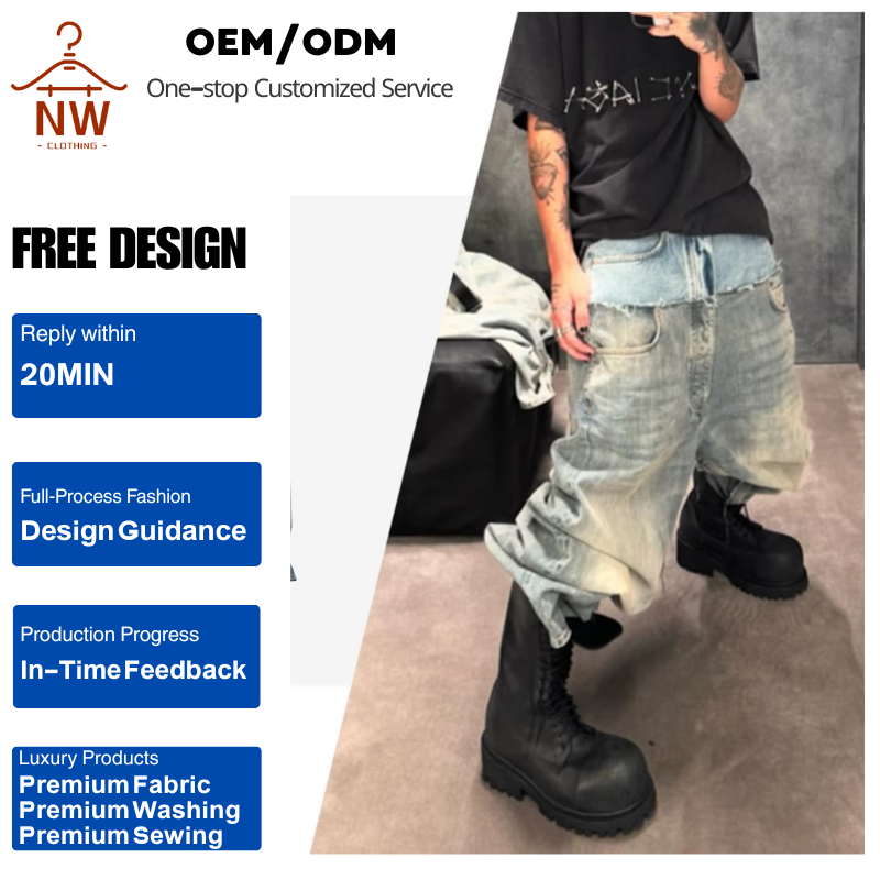 กางเกงยีนส์ทรงแบ็กกี้แบบสองชั้นสองเอวต่อผ้าสไตล์ดิสโทเรค ลายหนวดแมว สำหรับผู้ชายและผู้หญิง แฟชั่นสตรีทไฮสตรีท ทรงยูนิเซ็กส์