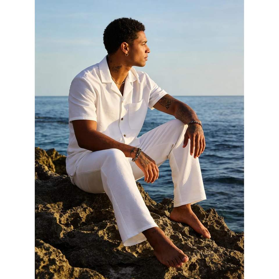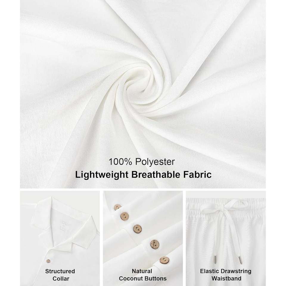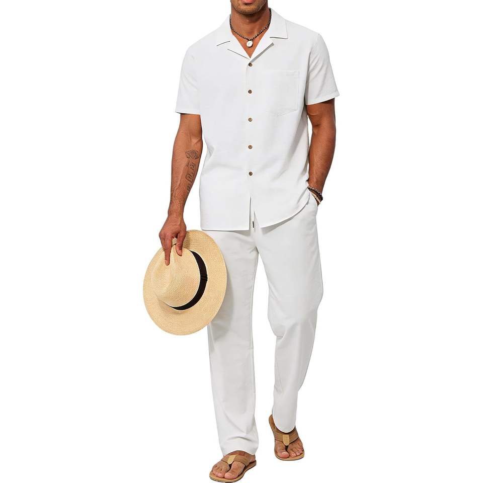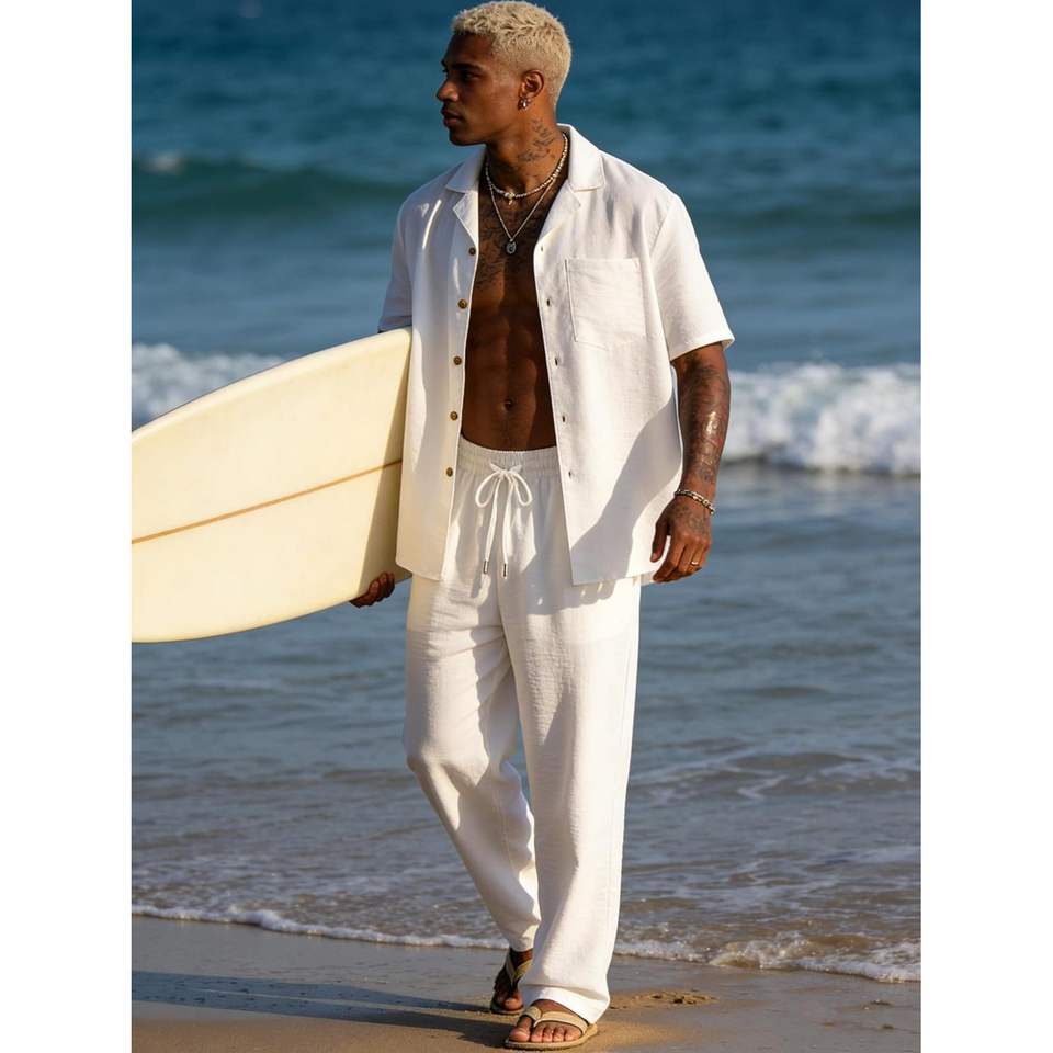 ชุดชายหาดผู้ชายแบบ 2 ชิ้น เสื้อเชิ้ตแขนสั้นผ้าฝ้ายสีขาว กางเกงขายาวหลวมๆ ชุดลำลองสำหรับฤดูร้อน