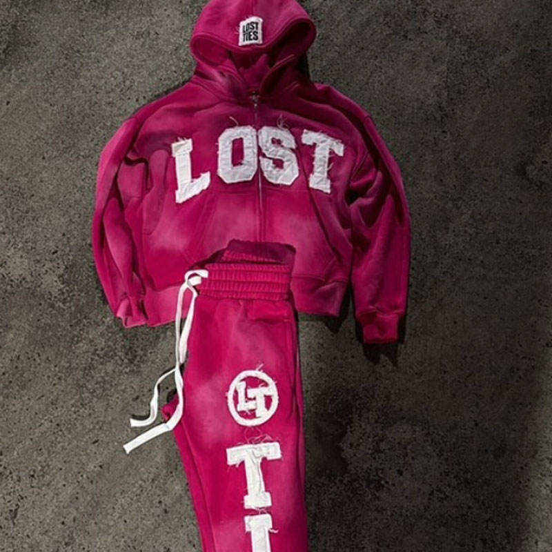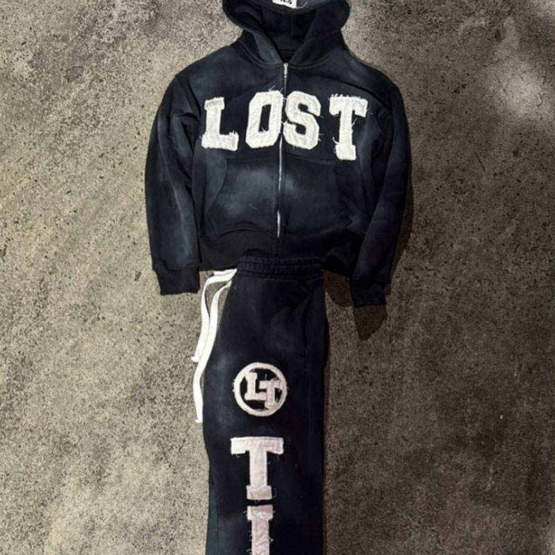 ชุดเซ็ตแทรคสูทแบบมีฮู้ดสำหรับฤดูหนาว สไตล์สตรีทแวร์ ยูนิเซ็กซ์ ผ้าคอตตอน 100% ทรงหนา สีพื้น ล้างสีแบบแอซิดวอช แต่งแพทช์ปักลายแบบดิสเทรส