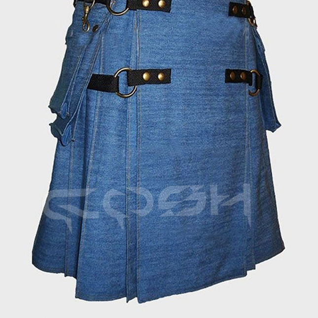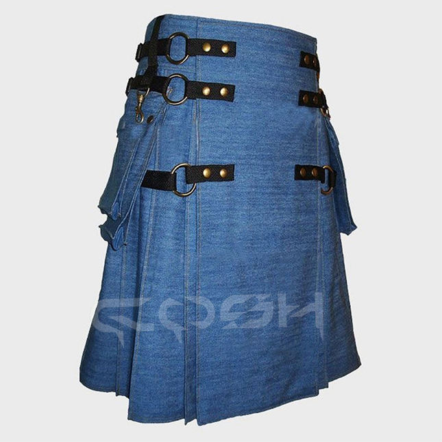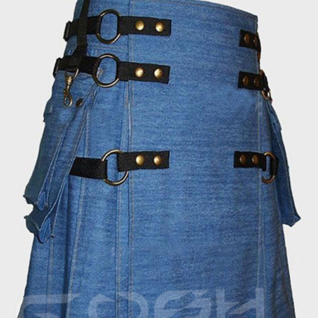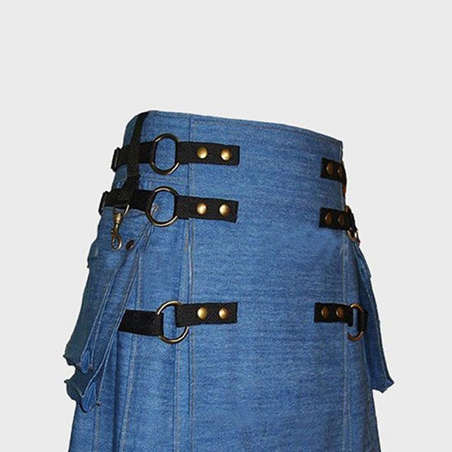 กระโปรงผ้ายีนส์ยูทิลิตี้สีฟ้าสำหรับผู้ชายกำหนดเอง | กระโปรงสั้นของแท้ทันสมัยพร้อมหัวเข็มขัดสุดพรีเมียมและผ้าคุณภาพสูงผู้จำหน่ายกระโปรงสั้นอเนกประสงค์