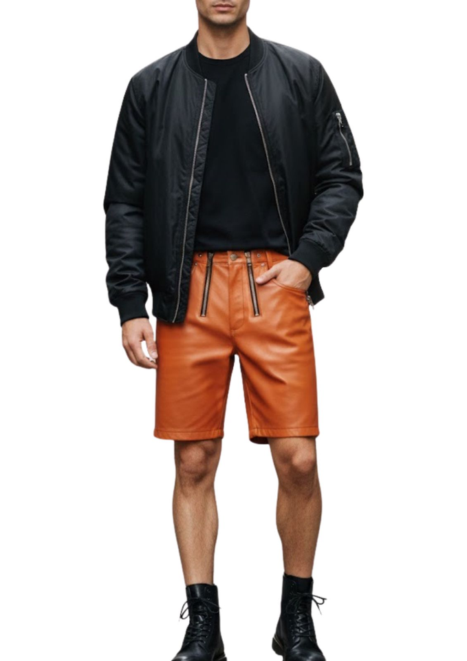 กางเกงขาสั้นหนังแท้ผู้ชายสั่งทำพิเศษ กระเป๋าซิปคู่ด้านหน้า ทรงเข้ารูป แฟชั่นสตรีทแวร์ ความยาวระดับเข่า ลายจุดประดับลูกปัด