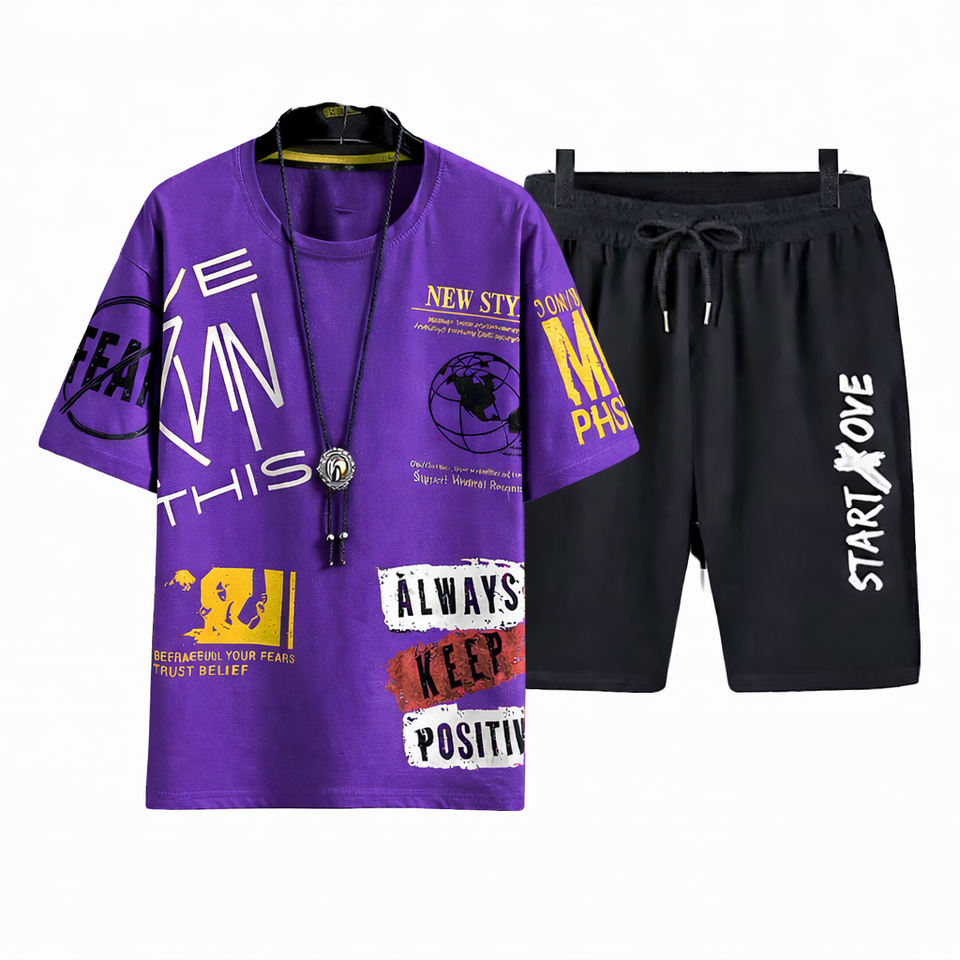 ชุดเสื้อยืดและกางเกงขาสั้นลายกราฟิกสำหรับผู้ชาย สีม่วง สไตล์สตรีทแวร์ ชุด 2 ชิ้น พร้อมเสื้อยืดพิมพ์ลายตัวอักษร และกางเกงขาสั้นสีดำรูดเชือก