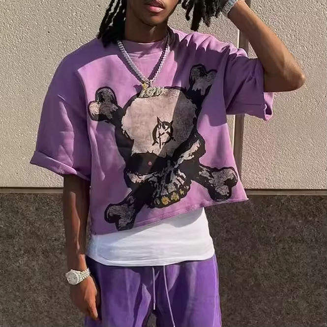 เสื้อยืดสตรีทแวร์ทรงโอเวอร์ไซส์แบบวินเทจ ตัดเย็บทรงครอป คอทรงกลม ผ้าหนา สำหรับผู้ชาย