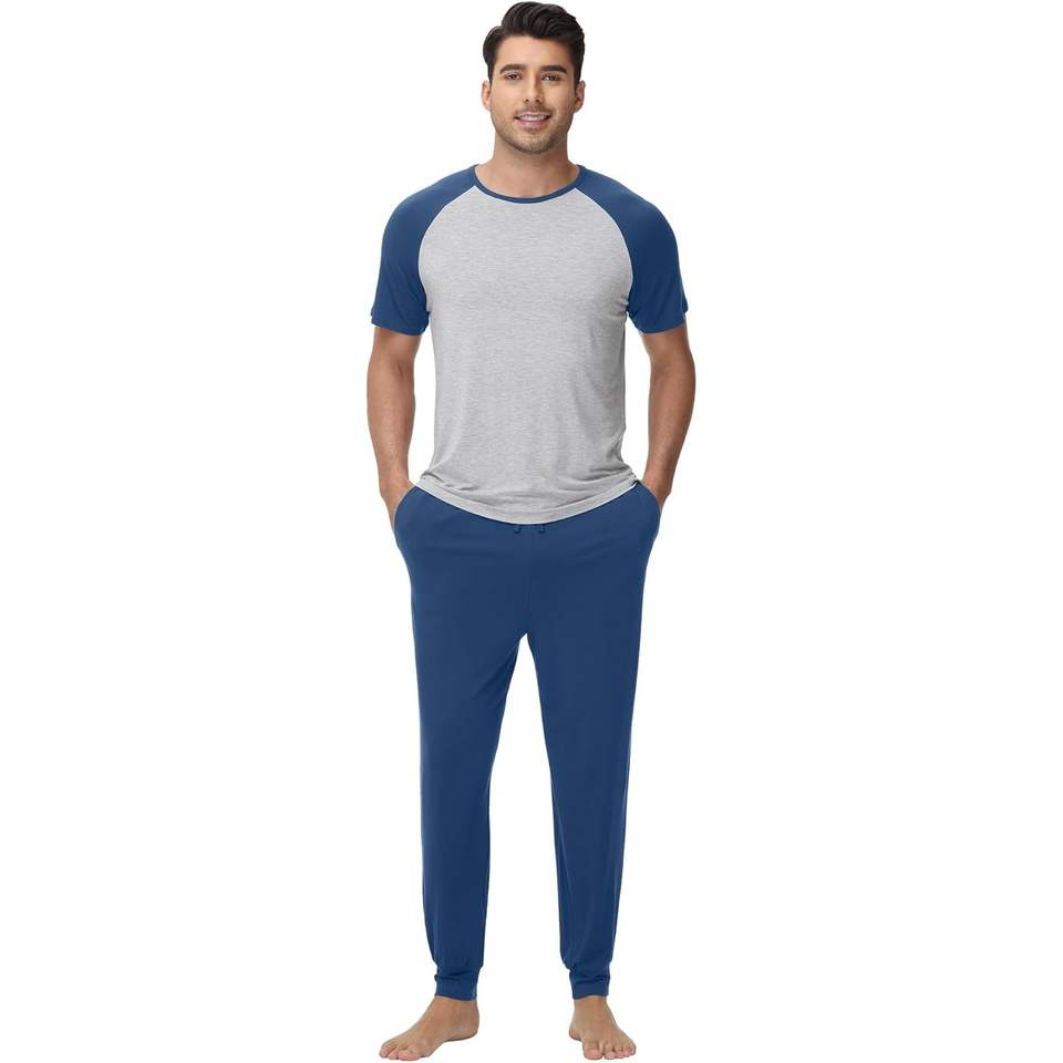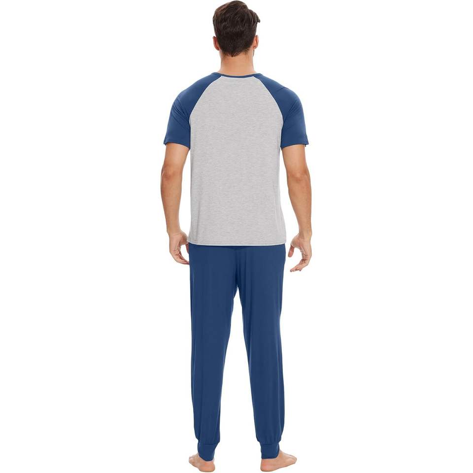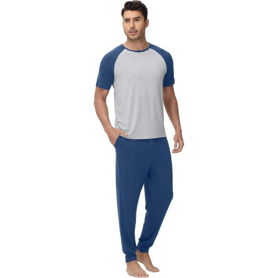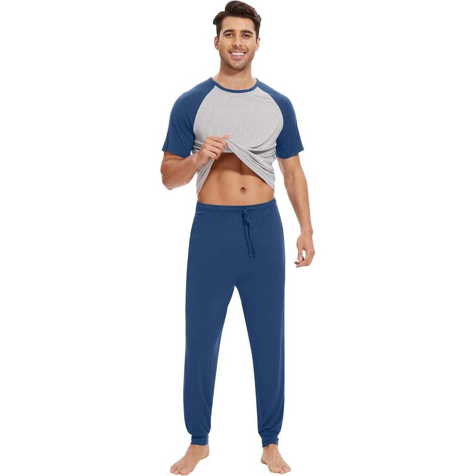 ชุดนอนผู้ชายแบบกำหนดเอง เสื้อยืดแขนสั้น กางเกงจ็อกเกอร์ ชุดนอนเนื้อนุ่ม ชุดนอนแร็กแลน ไซส์ S-XXL