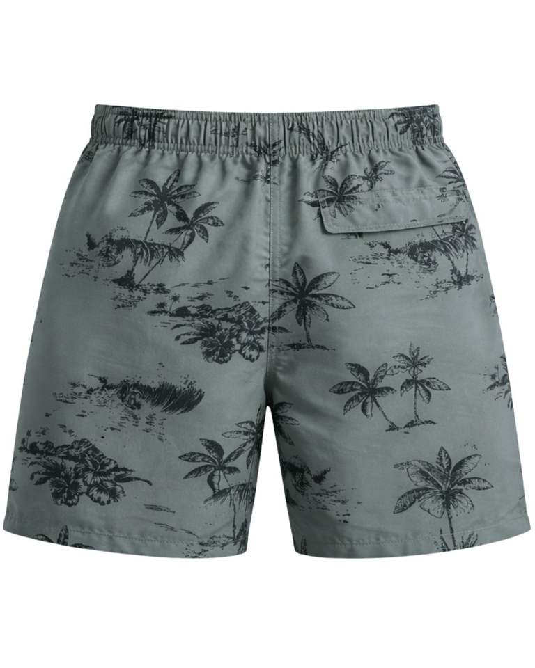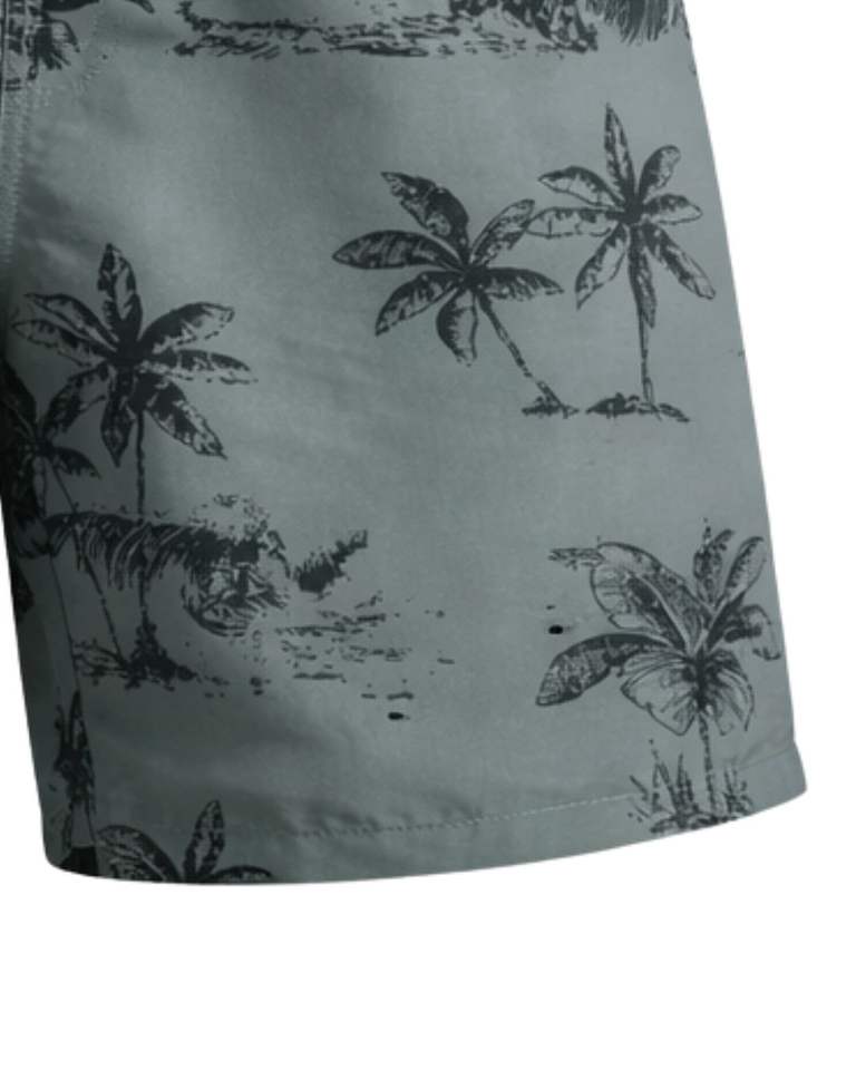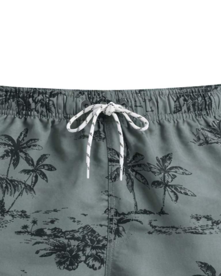 กางเกงว่ายน้ำชายพิมพ์ลายต้นปาล์มแบบกำหนดเอง แห้งเร็ว กางเกงชายหาด กางเกงเซิร์ฟบอร์ดเอวยางยืดพร้อมเชือกผูก OEM สั่งทำได้