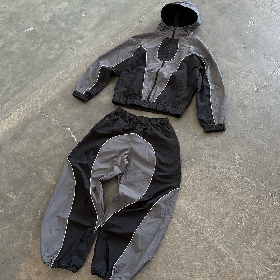 ชุดวอร์มผู้ชายแบบมีซิป แจ็คเก็ตและกางเกงขาสั้น ผ้าโพลีเอสเตอร์ผสมไนลอน ตกแต่งด้วยผ้าแบบแพทช์เวิร์ค