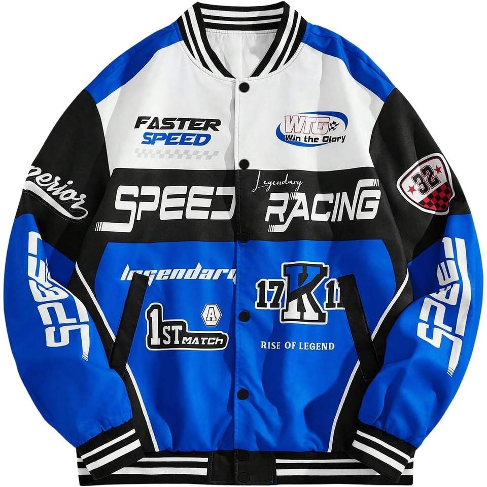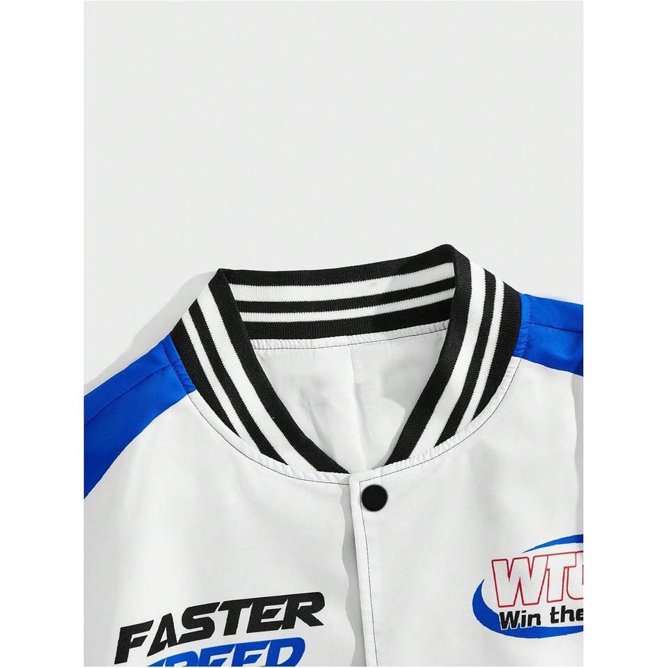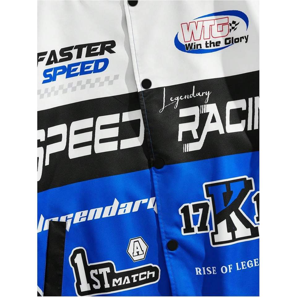เสื้อแจ็คเก็ตนักแข่งผู้ชายแบบสั่งทำพิเศษ แขนยาว กันลม ผลิตจากโพลีเอสเตอร์ พร้อมลายพิมพ์ความเร็วที่แขนซ้าย เหมาะสำหรับขี่มอเตอร์ไซค์