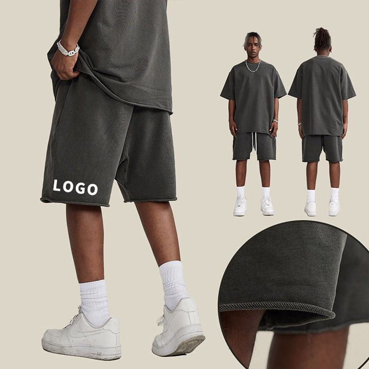กางเกงขาสั้นผ้าฝ้ายเฟรนช์เทอร์รี่แบบสบายๆ สำหรับผู้ชาย ทรงวินเทจ ลุคสตรีทแวร์ ขอบดิบ ซักย้อมสีแบบแอซิดวอช รักษ์โลก