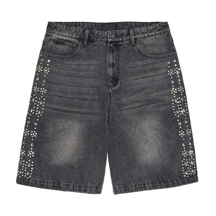 กางเกงขาสั้นผ้ายีนส์รุ่นกลางของผู้ชายกางเกงขาสั้นผ้าเดนิม100% คริสตัลประดับพลอยเทียมแนวสตรีท
