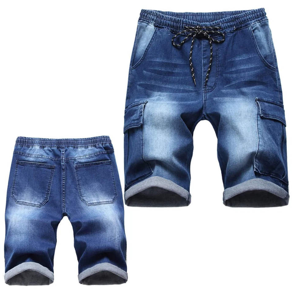 กางเกงยีนส์ขาสั้นทรงหลวมสำหรับผู้ชายใส่หน้าร้อน ไซส์ใหญ่ สีน้ำเงินฟอกยับ