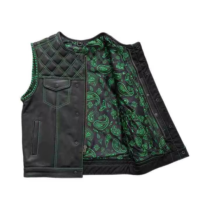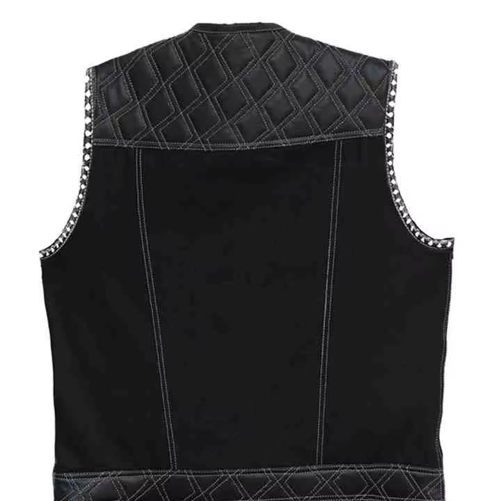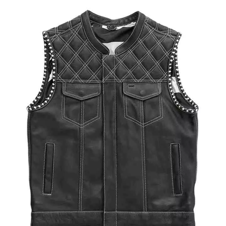 เสื้อกั๊กหนังสำหรับผู้ชายสไตล์นักขี่มอเตอร์ไซค์สำหรับฤดูร้อน ตกแต่งด้วยลายเพชรที่ไหล่และขอบประดับหมุด