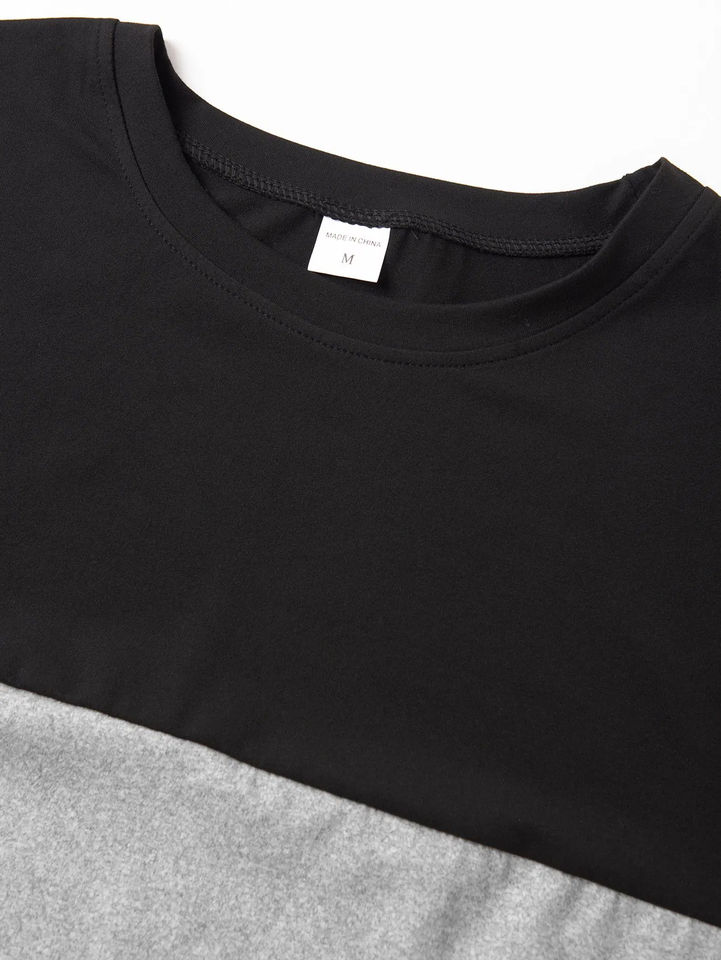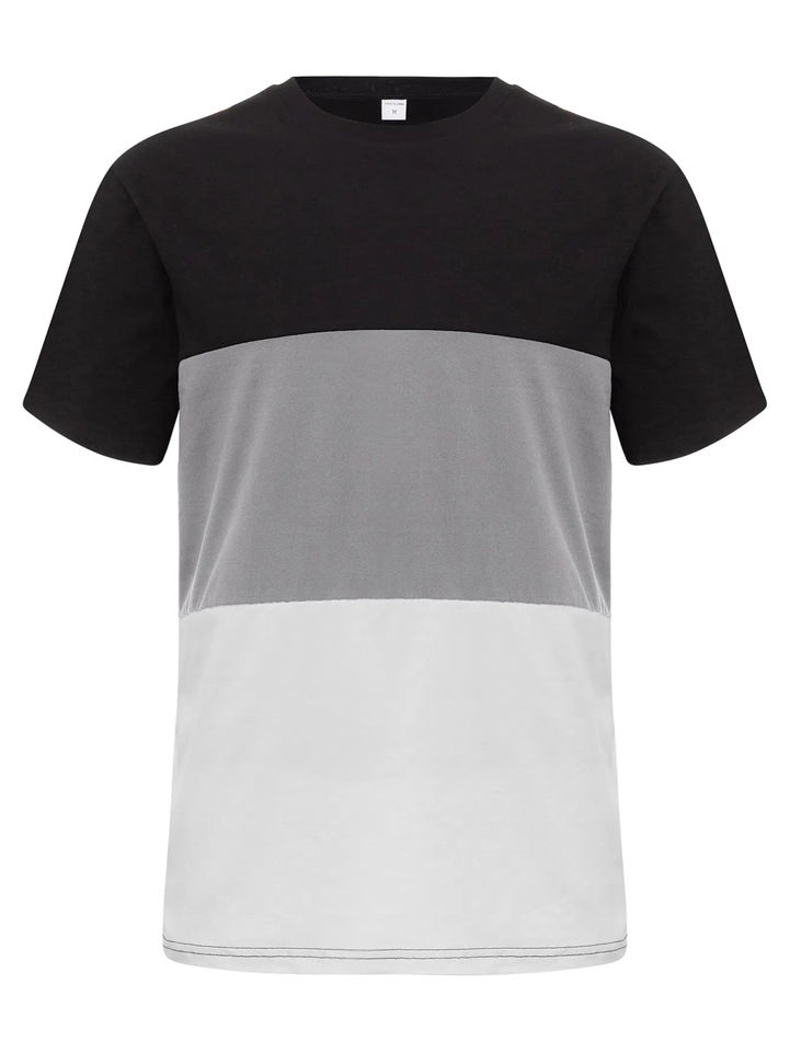เสื้อยืดแขนสั้นสำหรับผู้ชายสีบล็อกลูกเรือสามโทนสีแบบลำลองสีขาวดำสีเทา