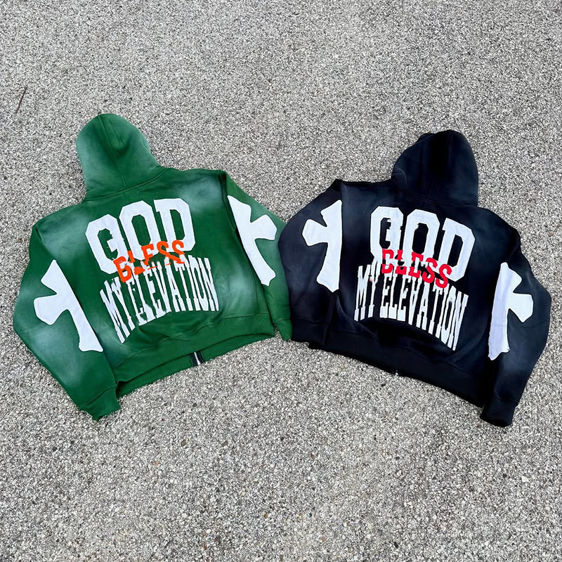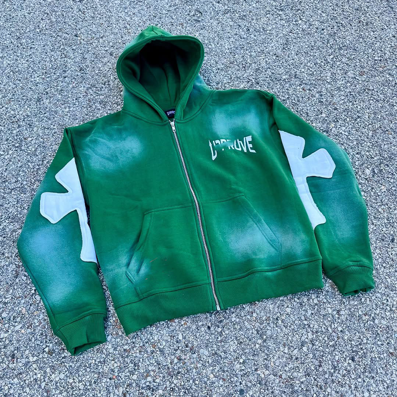 ชุดวอร์มสตรีทแวร์ฤดูหนาวแบบยูนิเซ็กซ์ ผ้าทึบ ปักโลโก้ ลายซีดจางแบบดิสเทรส ฮู้ดดี้ติดแพทช์ ซิปสองด้าน กางเกง