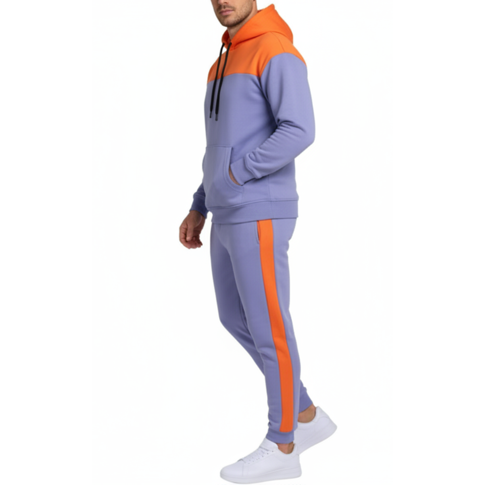 ชุดวอร์มผู้ชายสีสันสดใส สีส้มและสีฟ้าลาเวนเดอร์ แบบสองชิ้น เสื้อฮู้ดและกางเกงขายาว สไตล์สตรีทแวร์ เหมาะสำหรับการฝึกซ้อม