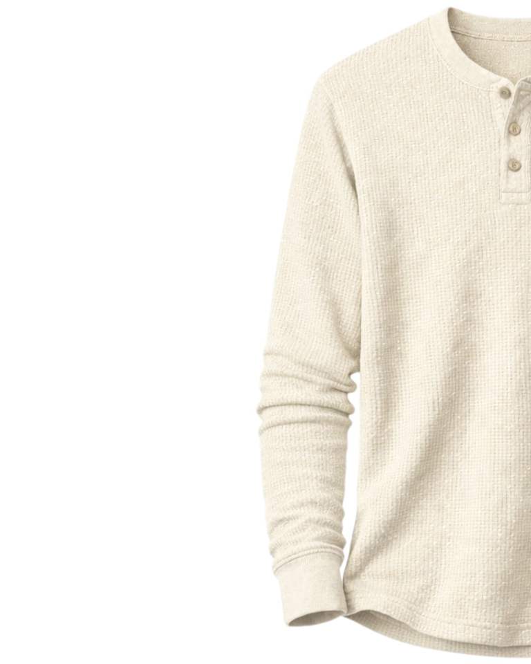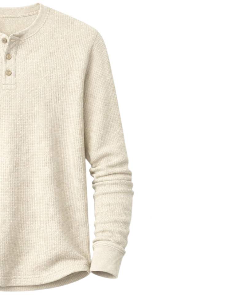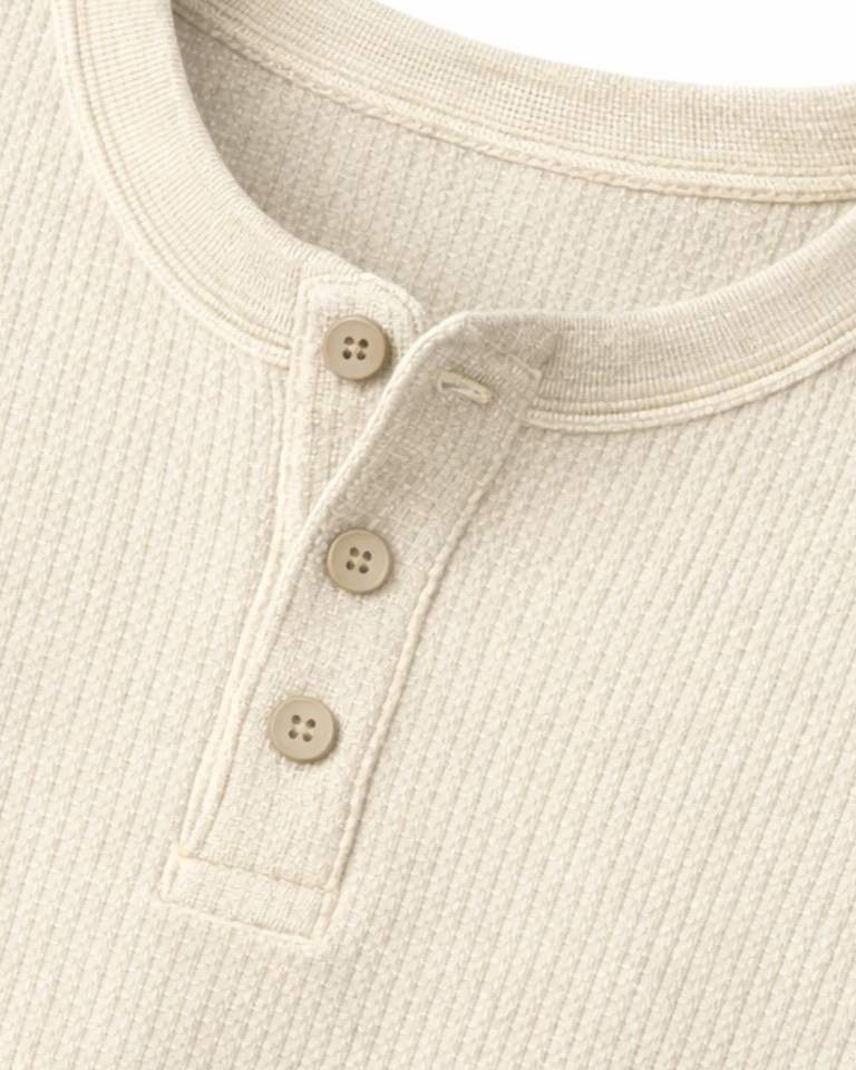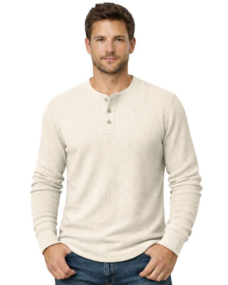 เสื้อยืดแขนยาวทรงเฮนลีย์ผ้าวาฟเฟิลสำหรับผู้ชาย สีงาช้าง สวมใส่สบาย คอติดกระดุม เหมาะสำหรับฤดูหนาว ผ้าฝ้ายทรงเข้ารูป ระบายอากาศได้ดี