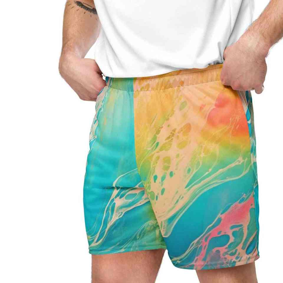 กางเกงว่ายน้ำขาสั้นสำหรับผู้ชายกางเกงพิมพ์ลายลายตาข่ายแบบซับลิเมชันออกแบบได้ตามต้องการดีไซน์เป็นลายทางสไตล์ใหม่