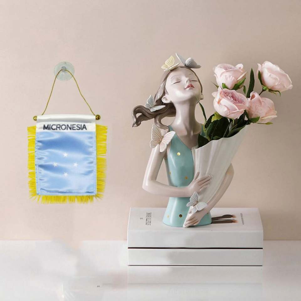 ธงสามเหลี่ยมไมโครนีเซียแบบกำหนดเอง พิมพ์ลายดิจิทัล ธงขนาดเล็กสำหรับยานยนต์ พร้อมพู่สีเหลือง ทำจากโพลีเอสเตอร์พลาสติก