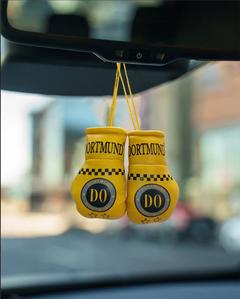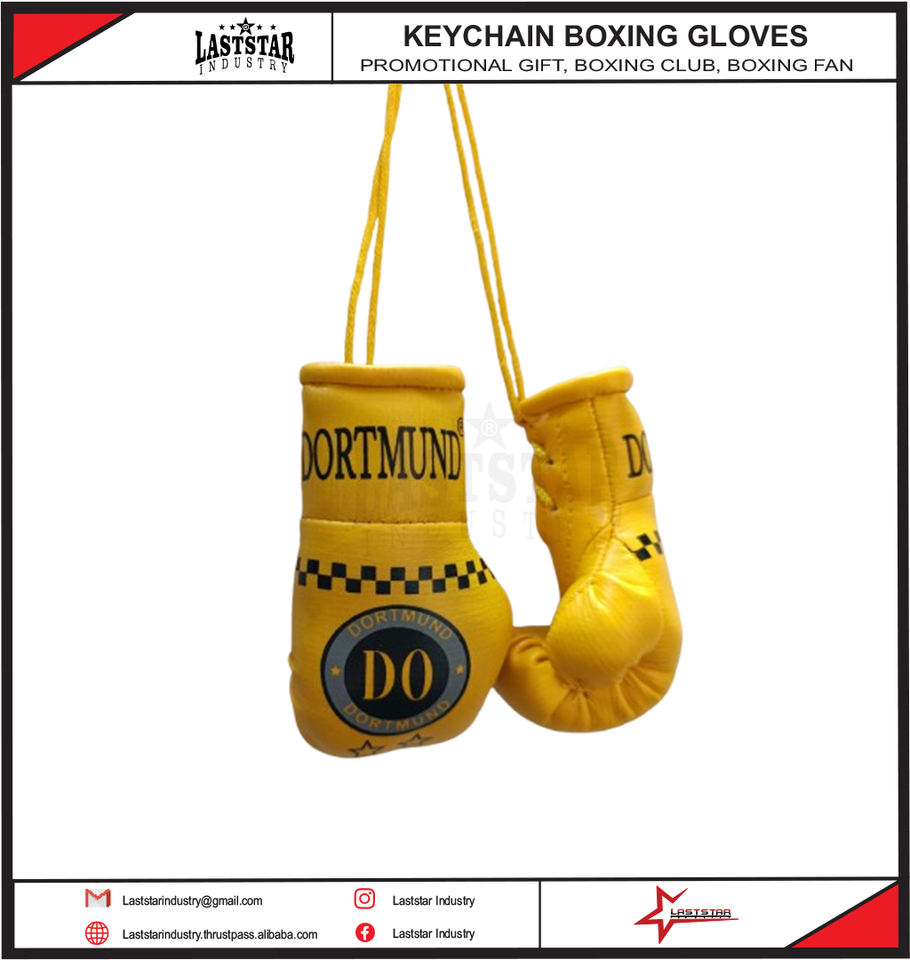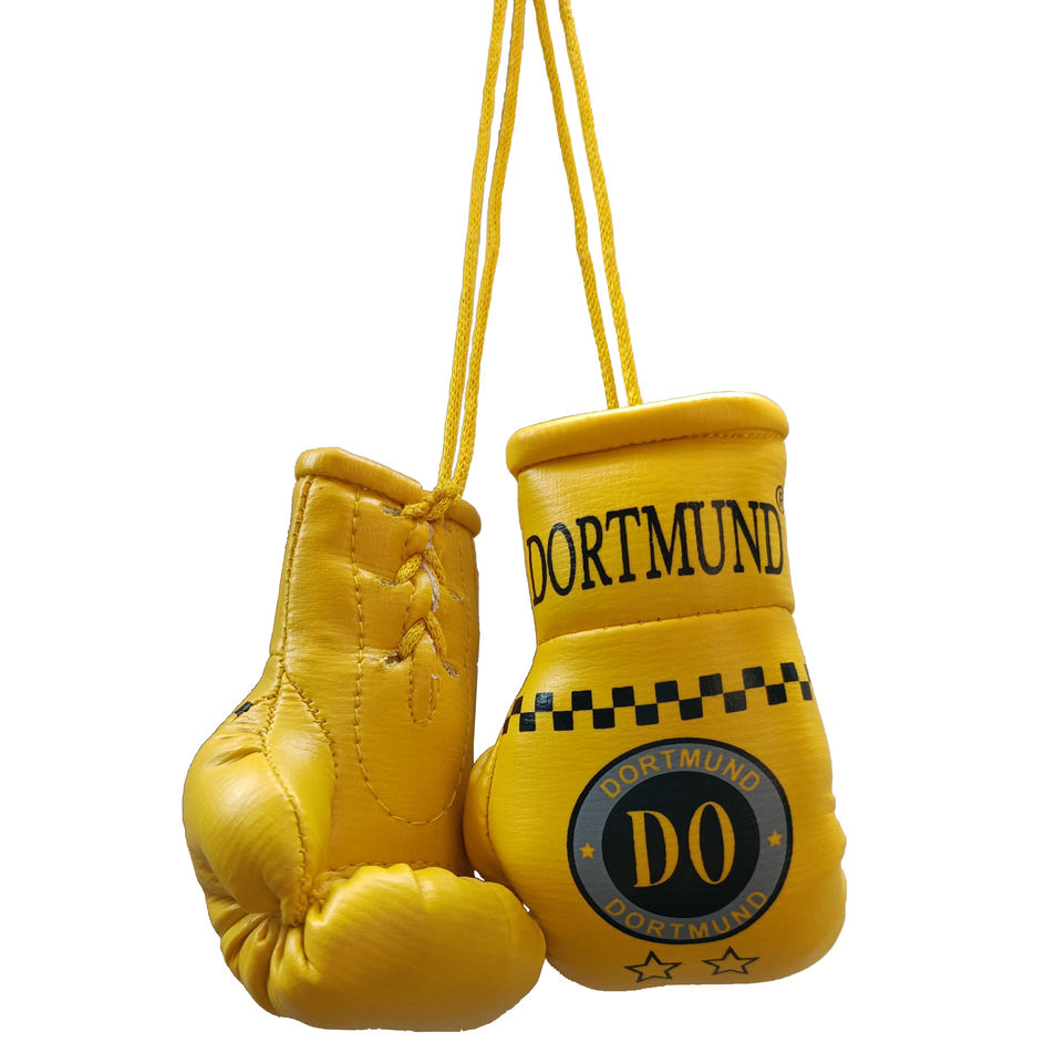 ถุงมือต่อยมวยขนาดเล็กพวงกุญแจแบบแขวนในรถทำจาก PVC ดีไซน์ธงดอร์ทมุนด์พวงกุญแจห้อยรถทำจากหนัง PU สั่งทำได้