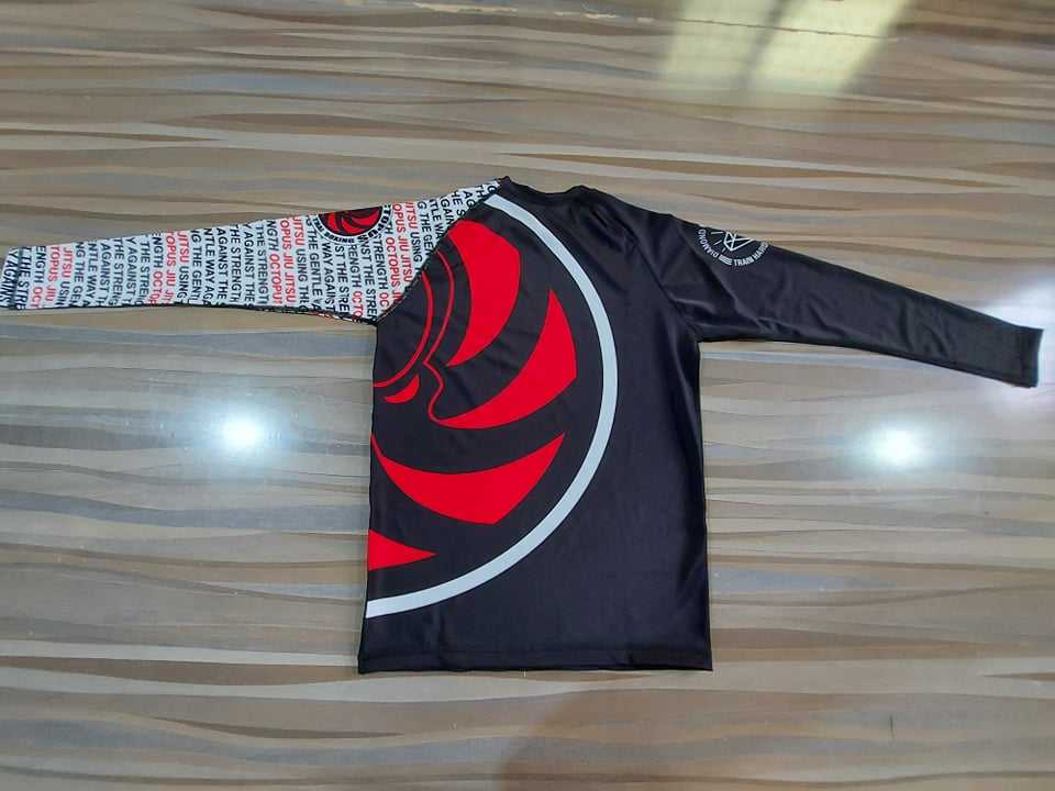 MMA เสื้อแรชการ์ดพิมพ์ซับลิเมชันกำหนดเอง240ป้องกันอัลทวอยเลต์ GSM การบีบอัดการต่อสู้แบบผดผื่น BJJ ผลิตในปากีสถาน