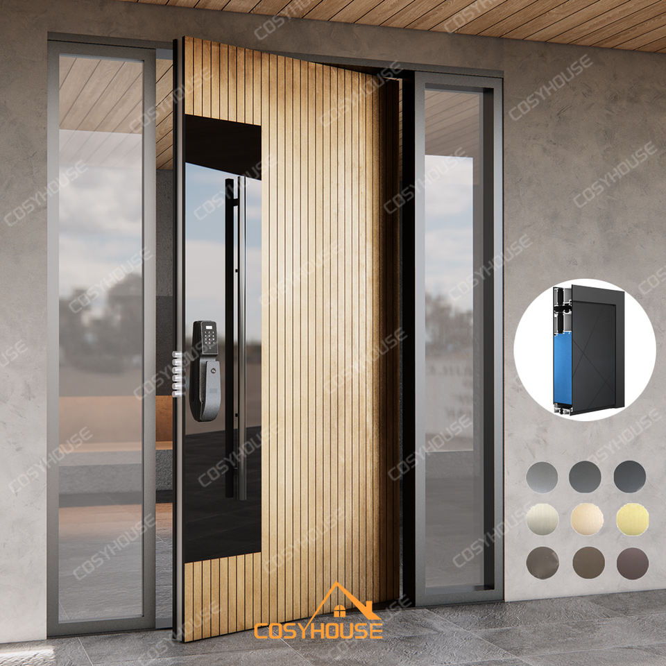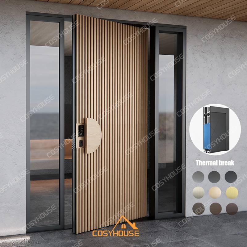 ประตูบานเดี่ยวอะลูมิเนียมแบบหมุนได้ ดีไซน์ทันสมัย ตกแต่งด้วยทองแดง พร้อมกระจกสีดำและแผงด้านข้างแบบติดตั้งถาวรสองบาน