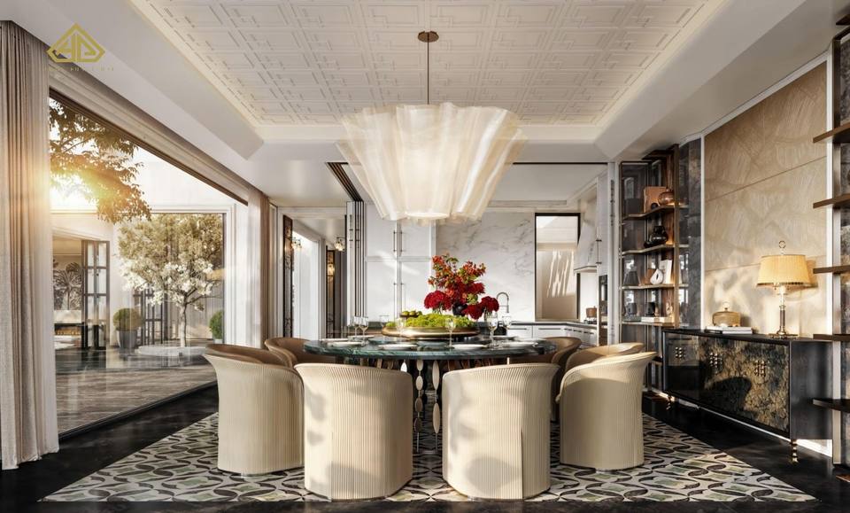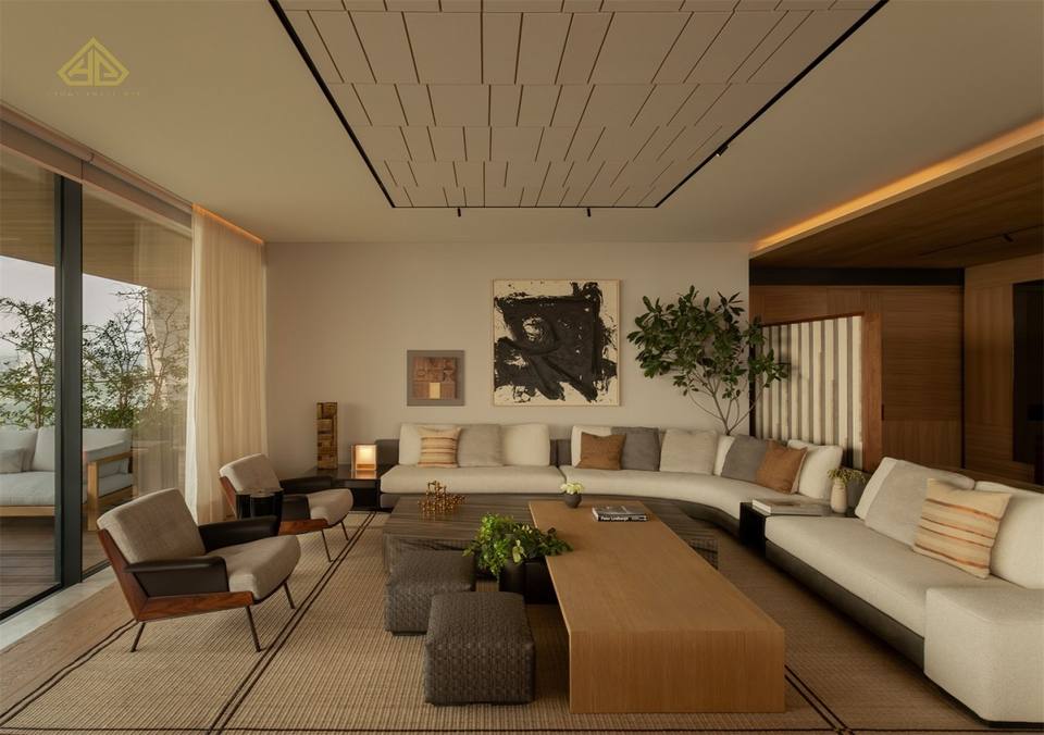 บริการออกแบบและปรับปรุงบ้านวิลล่าหรูสไตล์โมเดิร์นชนบท แบบสองชั้นครึ่ง หลังคาทรงจั่ว พร้อมระเบียงเปิดโล่ง